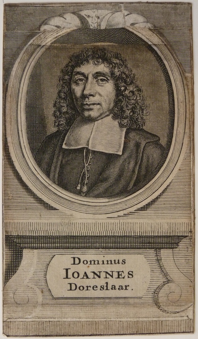 Borstbeeld naar links. In ovaal met randwerk en drieregelig onderschrift: 'Dominus Ioannes Doreslaar'. De bovenzijde van de prent is afgesneden en voorzien van een nieuw stuk ovaal (van een andere prent?). Middenboven een gerepareerde scheur.