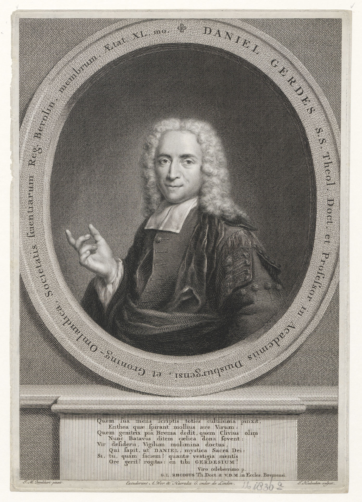 Halffiguur naar links met opgeheven rechterhand. In ovaal met randschrift: 'Daniel Gerdes ... Aet XL mo'. Achtregelig Latijns vers door G.L. Rhodius, 'Quem sua mens ... Gerdesium'.