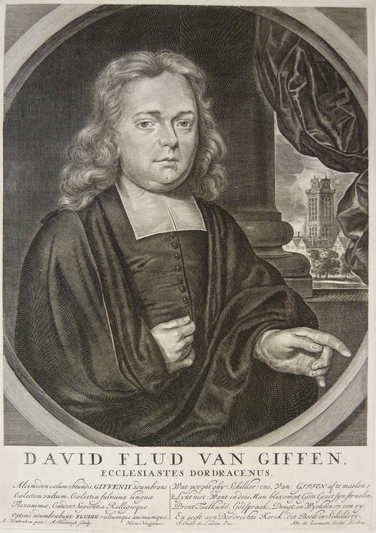 Halffiguur naar rechts. In gebroken ovaal met rechts op de achtergrond de Grote Kerk van Dordrecht. Tweeregelig onderschrift: 'David Flud van Giffen ... Dordracenus' en een vierregelig Latijns vers door Herm. Neuspitzer: 'Alcimedon ... animumque' en een vierregelig vers door Abr. de Leonards: 'Wat pooght ghy ... Schildery'.