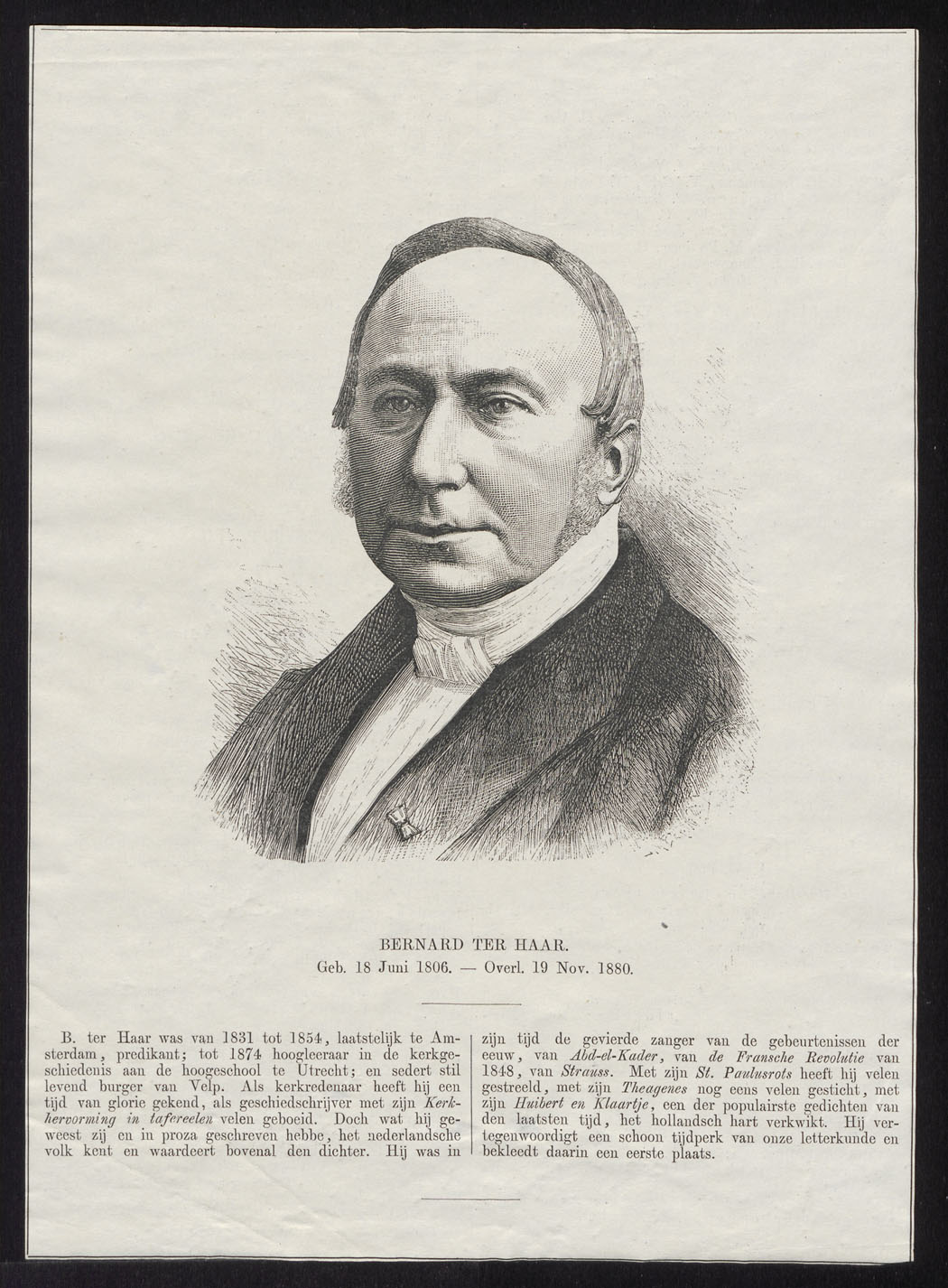 Portret van Bernard ter Haar (1806-1881), predikant te Amsterdam, hoogleraar kerkgeschiedenis