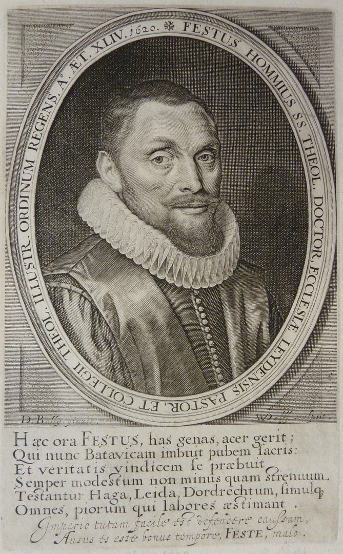 Borstbeeld naar rechts. In ovaal, met randschrift: 'Festus Hommius SS Theol. Docter...'. Met zesregelig latijns vers en tweeregelig latijns vers.