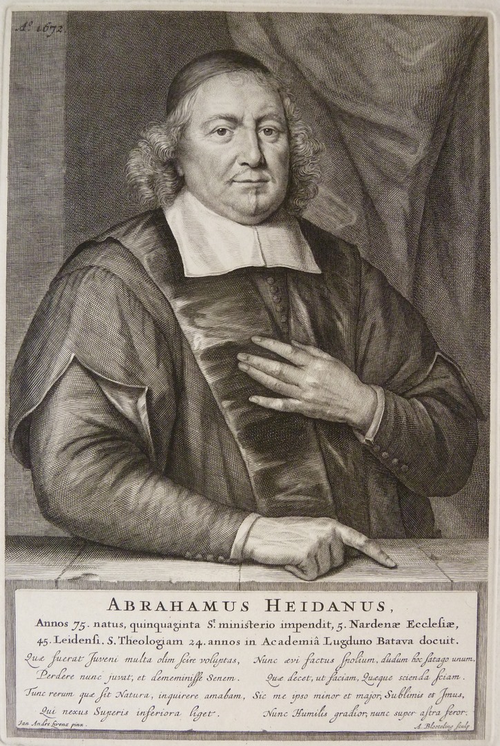 Halffiguur naar rechts, met hand op de borst. Met drieregelig Latijns onderschrift: 'Abrahamus Heidanus ... docuit' en achtregelig Latijns onderschrift: 'Sue fuerat ... feror'.