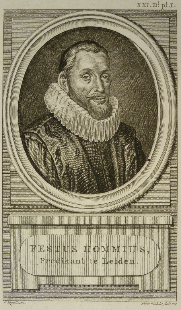 Borstbeeld naar rechts. In ovaal. Met tweeregelig onderschrift: 'Festus Hommius predikant te Leiden'.
