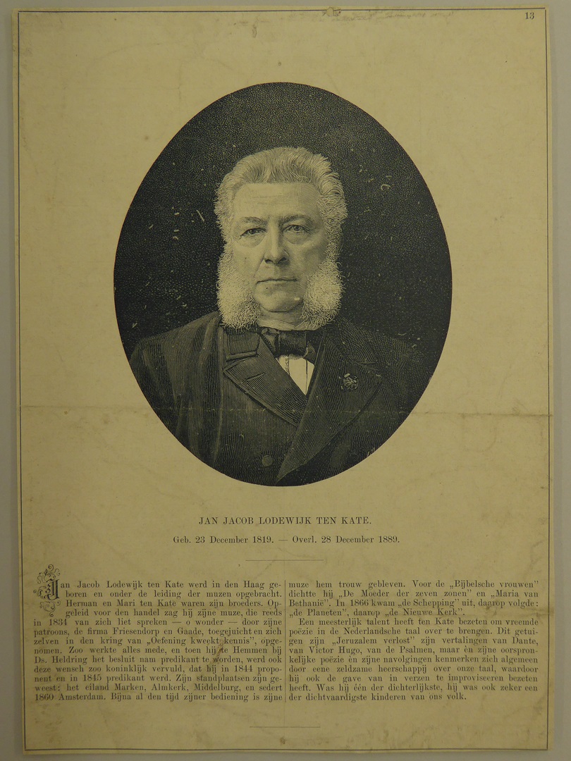 Portret van Jan Jacob Lodewijk ten Kate (1819-1889), predikant en dichter te Amsterdam, met biografie in twee kolommen