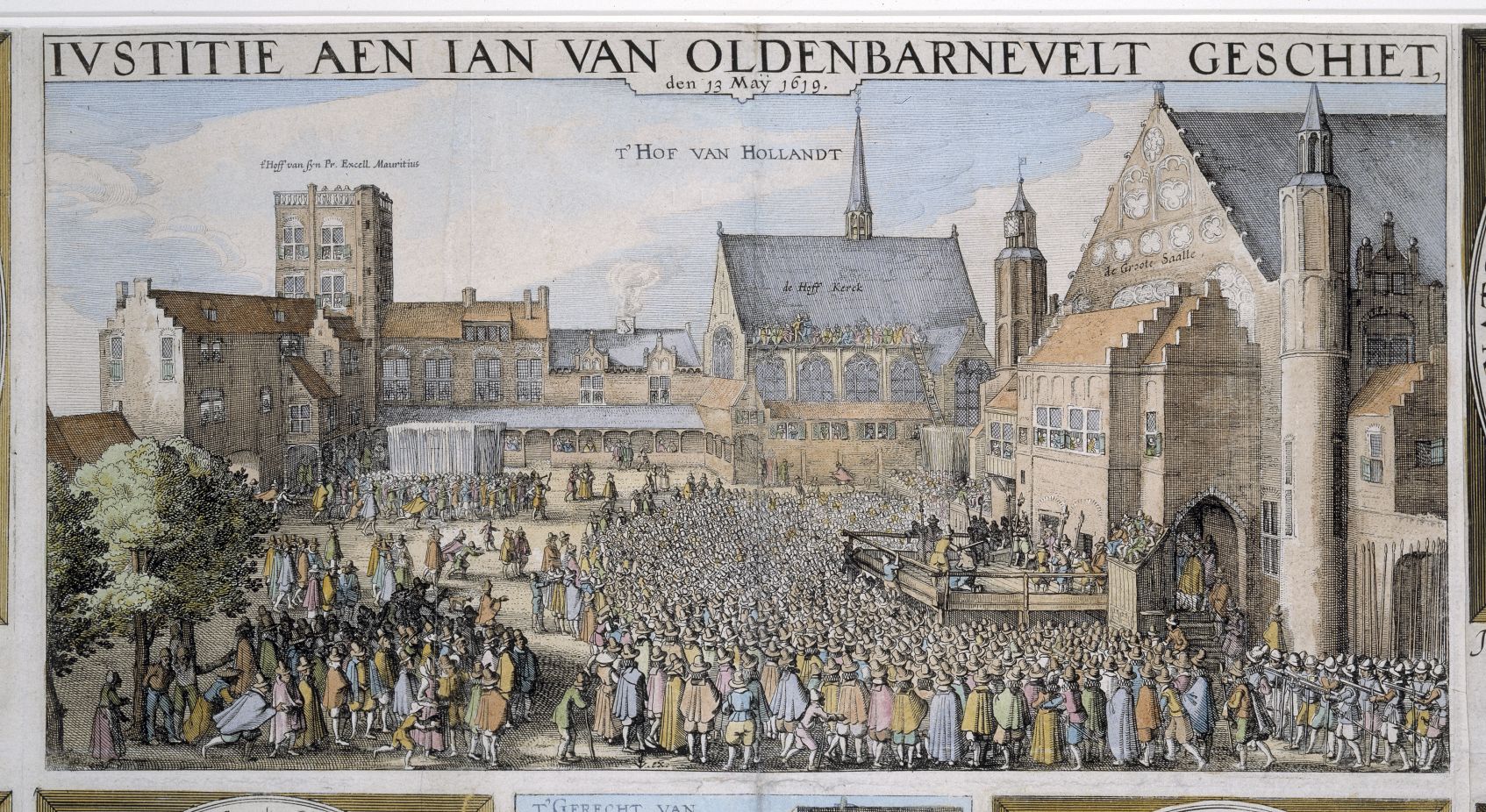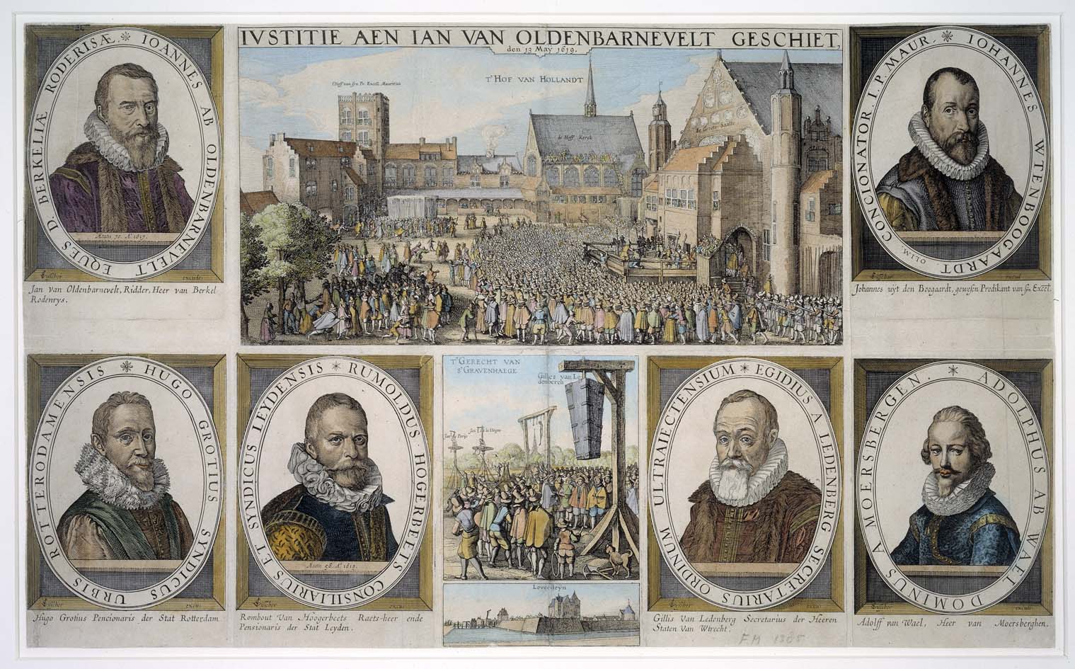 De prent is samengesteld uit twee historische voorstellingen (de onthoofding van Oldenbarnevelt op het Binnenhof in Den Haag en het ophangen van de kist van Ledenberg), een gezicht op Loevestein, en zes portretten, elk in een ovaal, te weten van Oldenbarnevelt, Wtenbogaert, Hugo de Groot, Hogerbeets, Ledenberg en De Wael van Moersbergen.