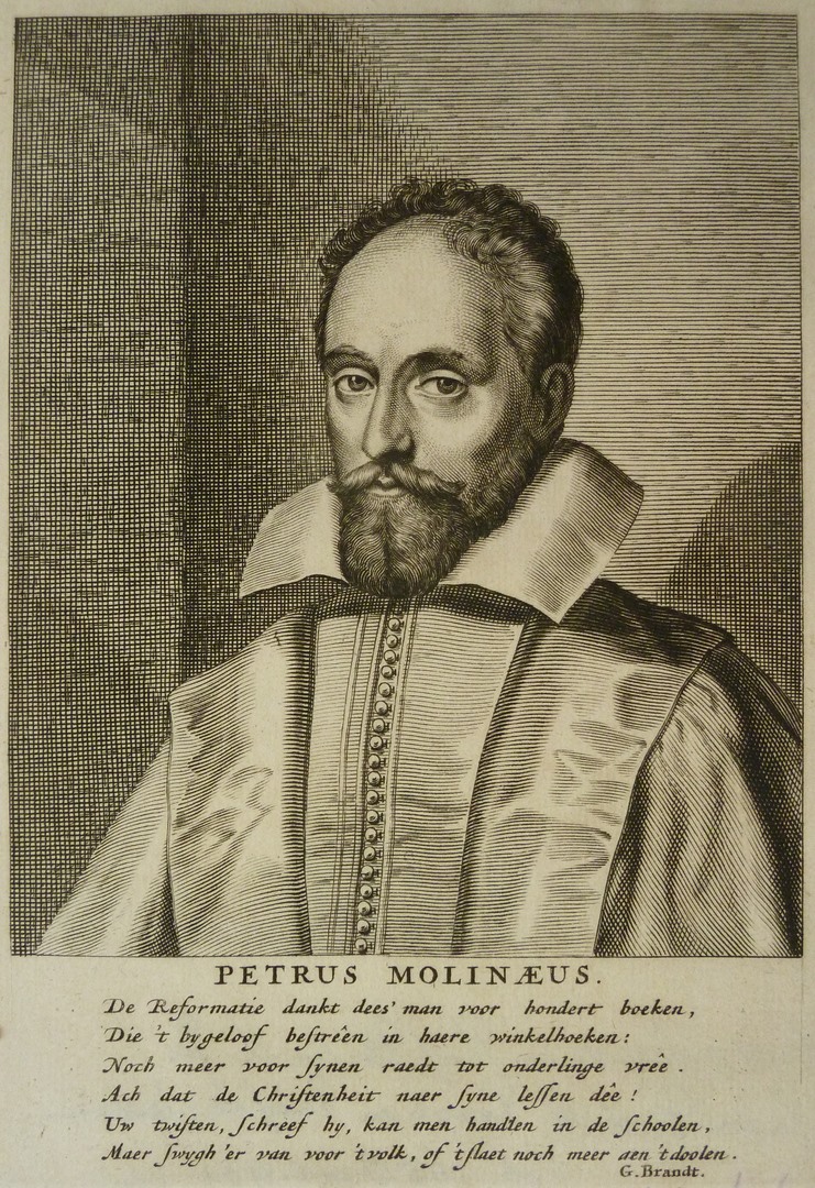 Borstbeeld naar links. Met onderschrift: 'Petrus Molinaeus' en zesregelig gedicht door G. Brandt, 'De Reformatie dankt ... doolen'.