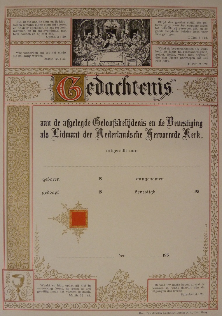 Gecalligrafeerde tekst 'Gedachtenis...'. Daarboven, in kaders, vier bijbelteksten en een voorstelling van het Laatste Avondmaal. Aan onderzijde afbeelding van een kelk en twee bijbelteksten in een kader. Het document is niet ingevuld.