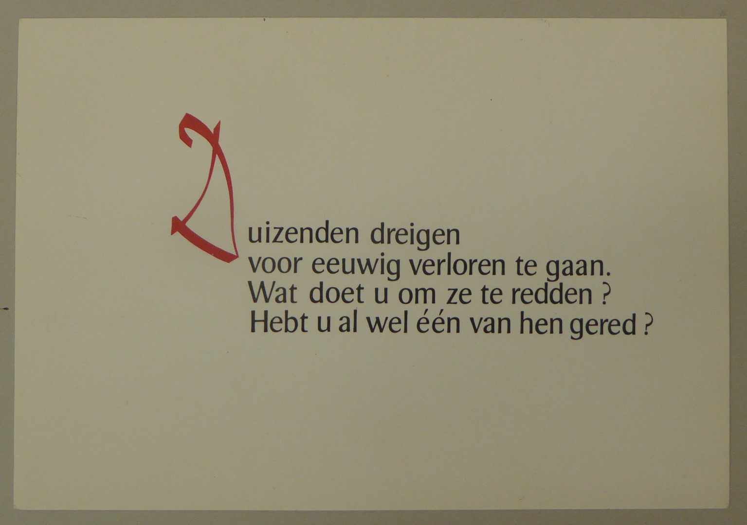 Boekdruk in zwart en rood met "Duizenden dreigen voor eeuwig verloren te gaan. Wat doet u om ze te redden? ..."