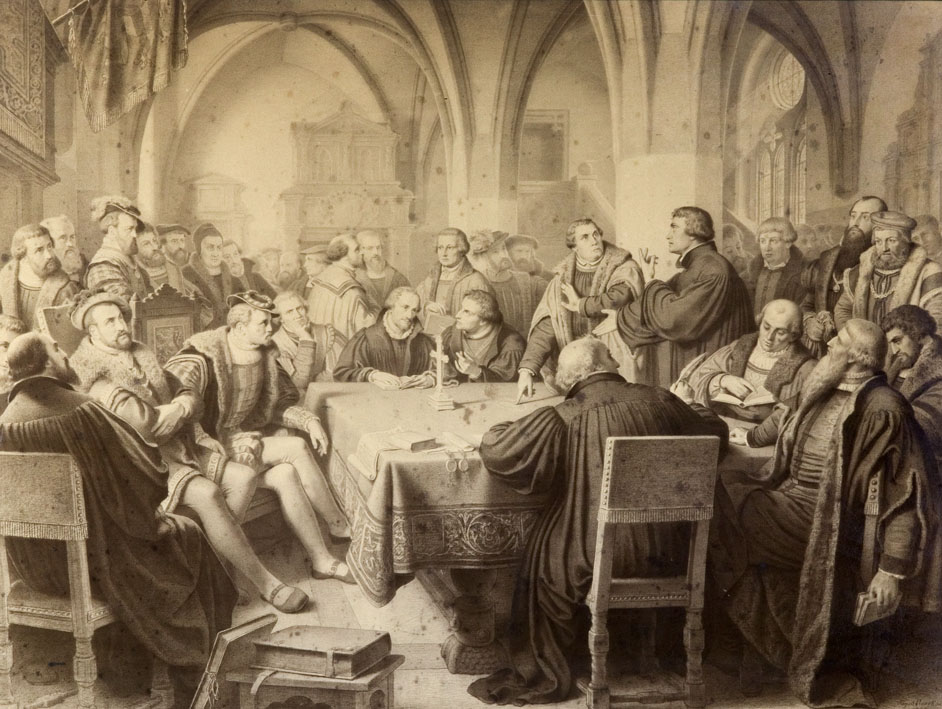 Godsdienstgesprek van Luther en Zwingli te Marburg, 1529 met o.m. Luther, Zwingli enz.