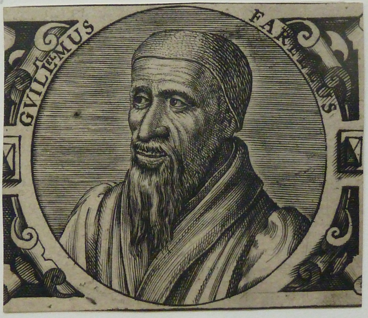 Borstbeeld links,in medaillon,omgeven door rolwerk. Randschrift: 'Guilelmus Farellus'.
