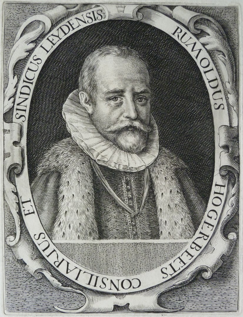 Borstbeeld naar rechts, in ovaal, met randschrift 'Rumoldus Hogerbeets Consiliarius et sindicus leydensis'.