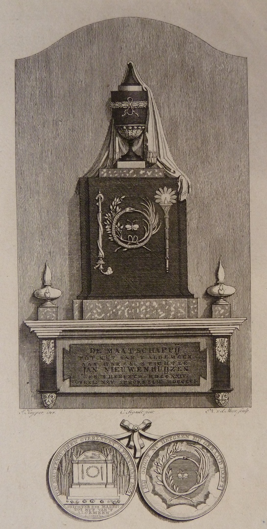 Graftombe met zinnebeelden en zesregelige inscriptie. Hieronder de voor-en achterzijde van een gedenkpenning op zijn dood.