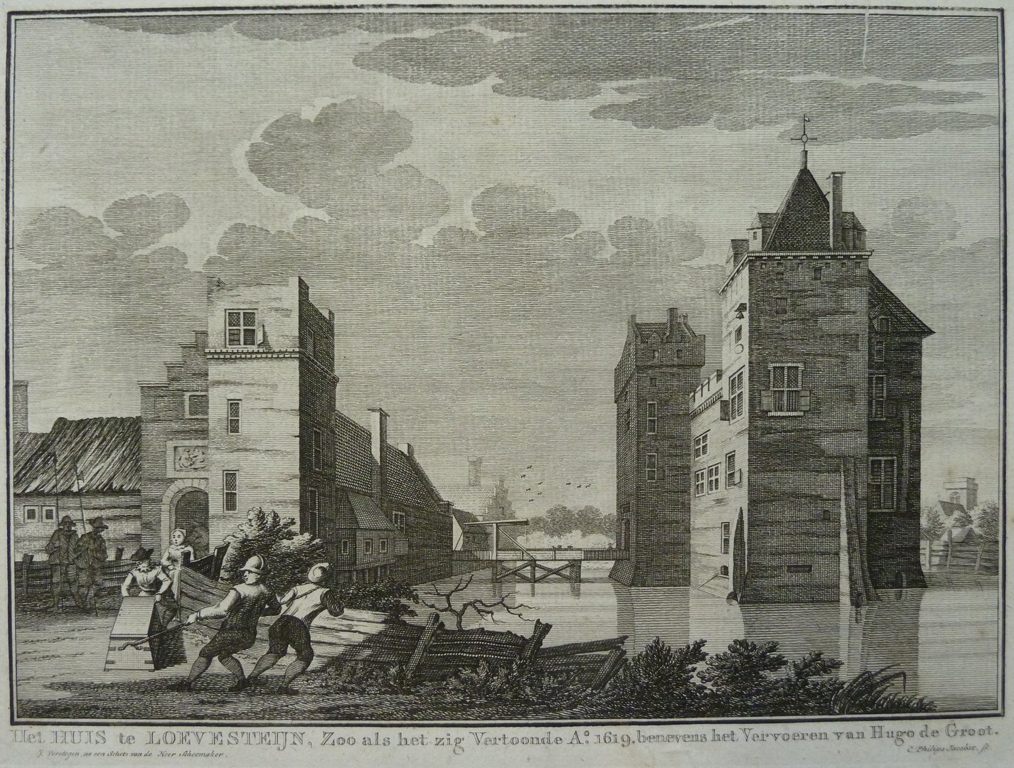 Huis te Loevesteijn, zoo als het zig vertoonde ao. 1619 benevens het vervoeren van Hugo de Groot