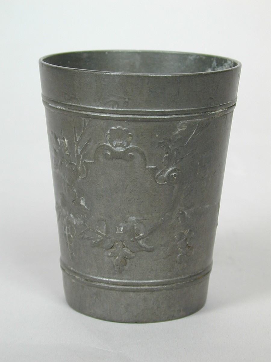 Bekertje met boven en onder randje van twee ribbels een cartouche omgeven door wijnranken