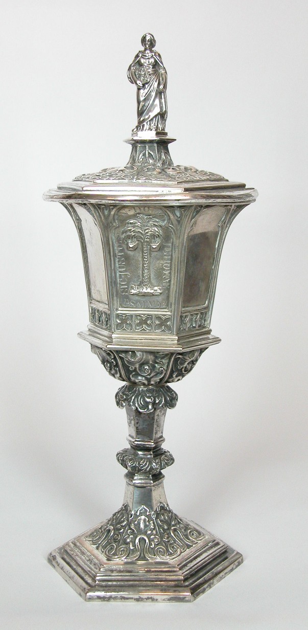 Avondmaalsbeker met deksel, afkomstig uit de gemeente Hanau (D.), met afbeelding van palmboom