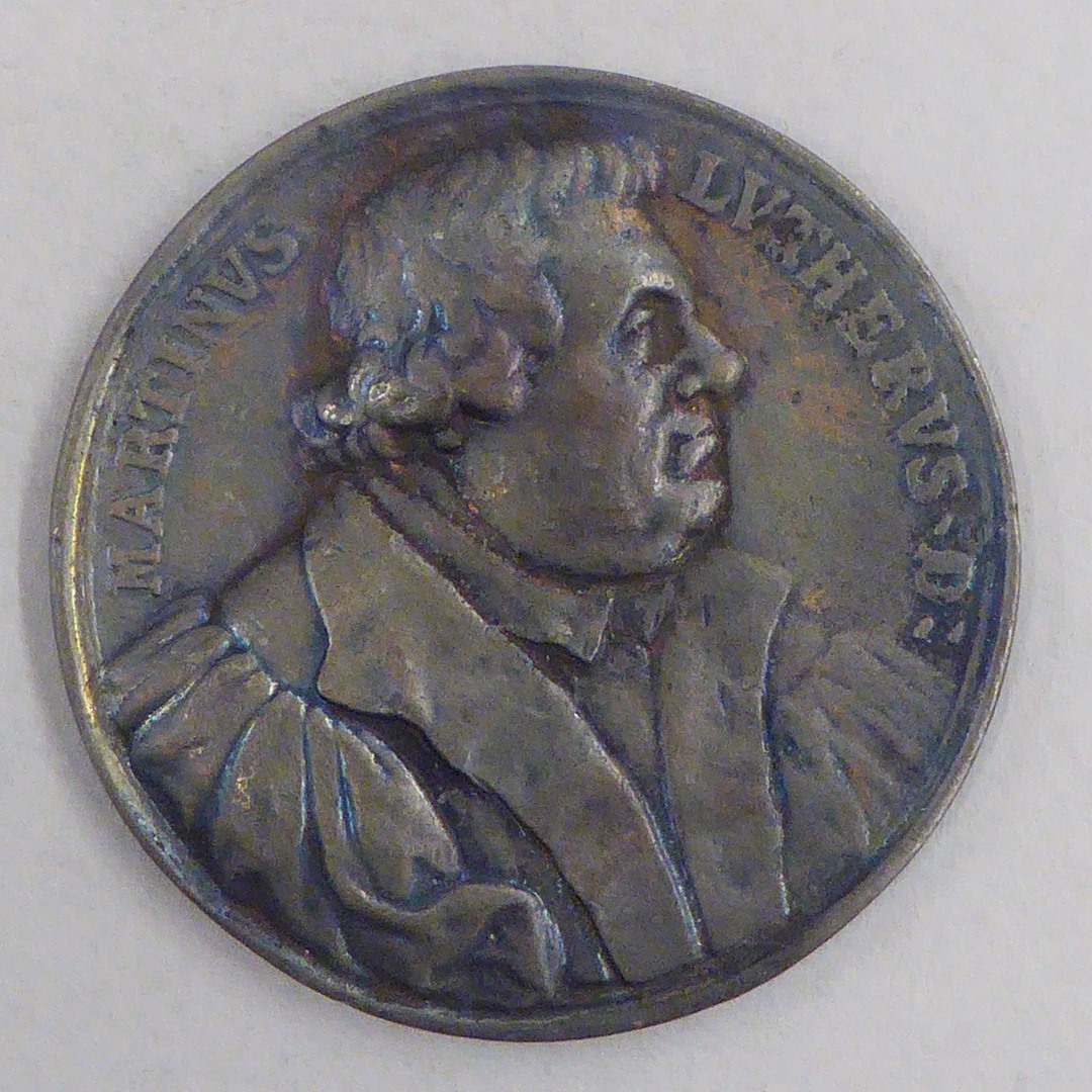 Penning met portret Luther en zijn naam, kz. altaar met boek met hart en kruis, tekst