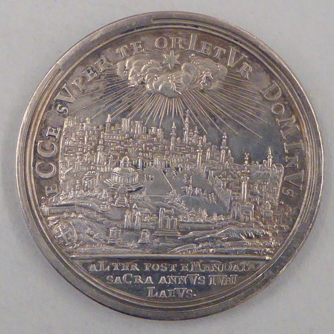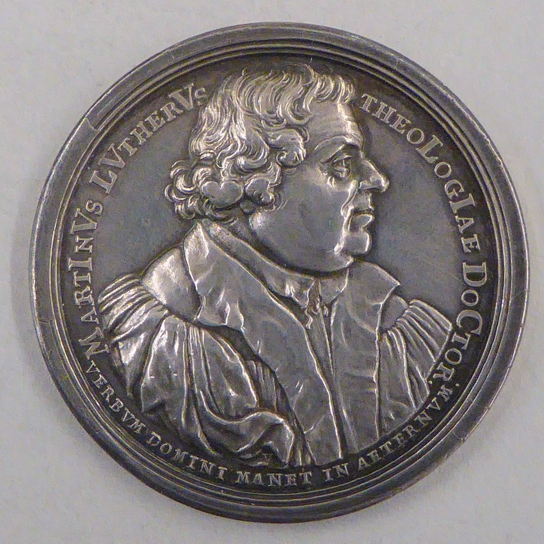 Penning met portret Luther, tekst, kz. Jeruzalem, wolken, engelen, met "Ecce super...annus iubilaeus"
