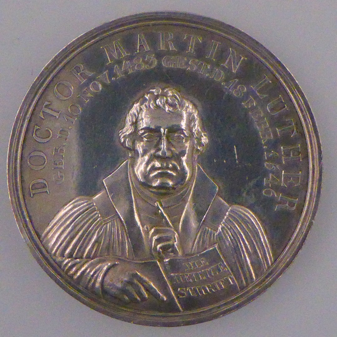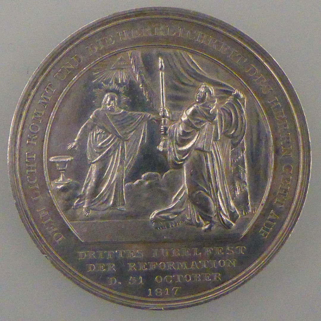 Penning met portret Luther, tekst, kz. Luther als monnik, gordijn wegtrekkend, waarachter Christus