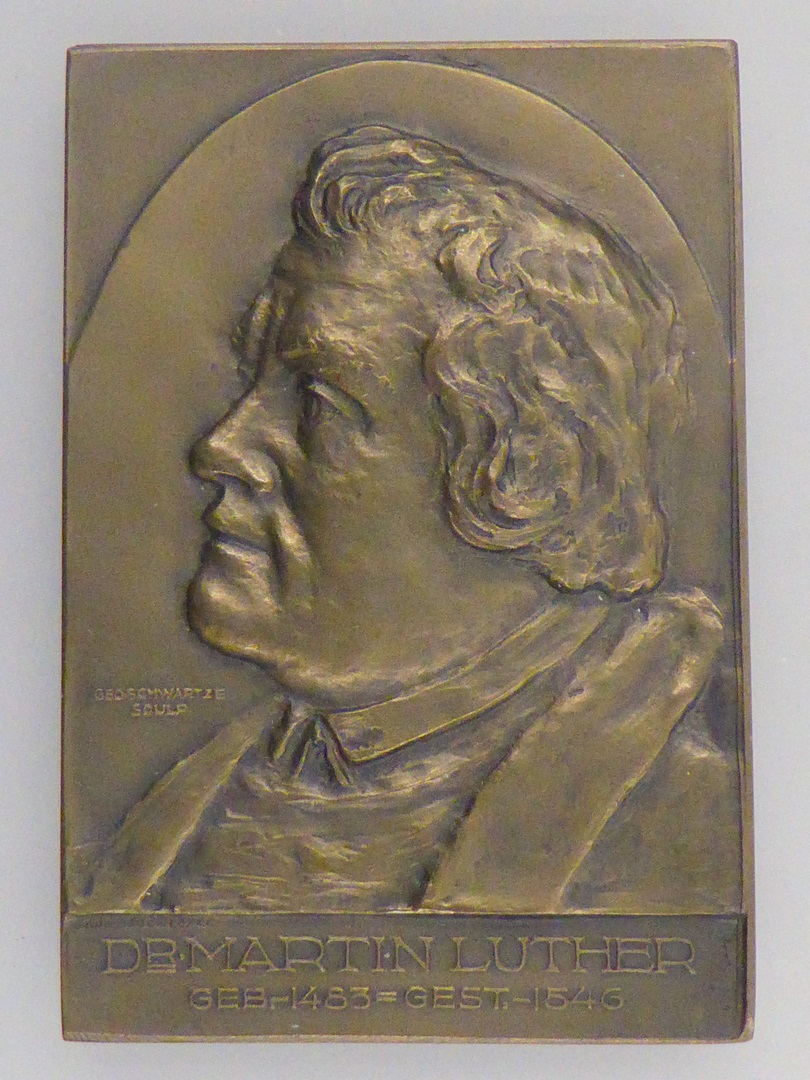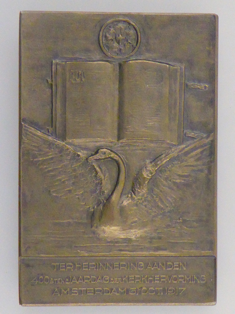 Legpenning met portret Luther, tekst, kz. bijbel tussen vleugels van zwaan, roos, onderschrift