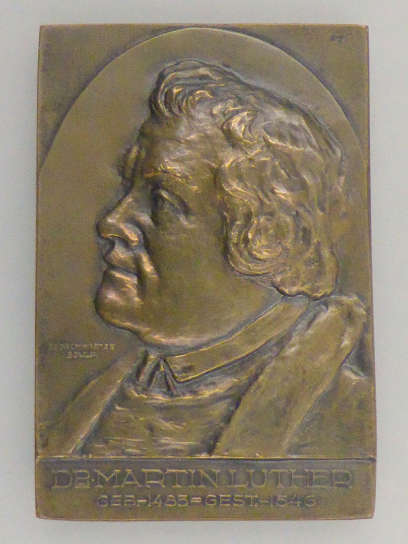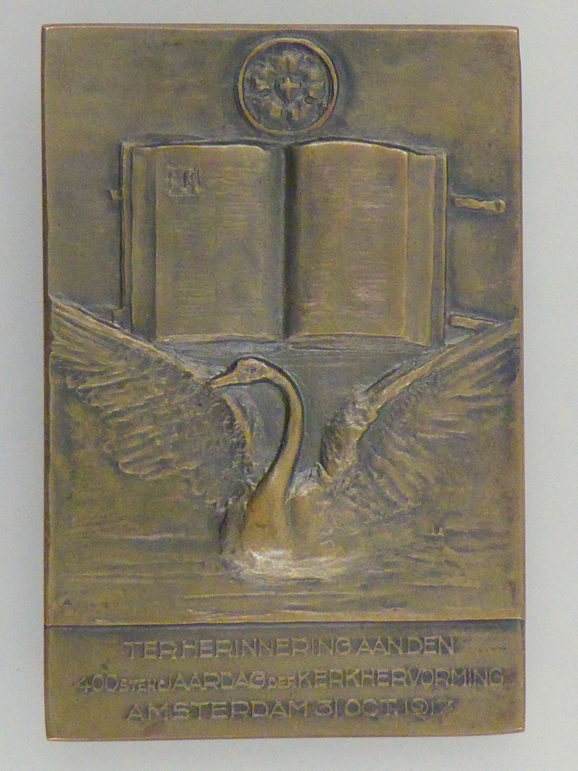 Legpenning met portret Luther, tekst, kz. bijbel tussen vleugels van zwaan, roos, onderschrift