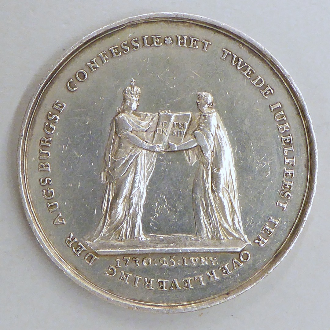 Penning, zwevende engel met tekstlint, randschrift, kz. Luther biedt keizer Confessie aan