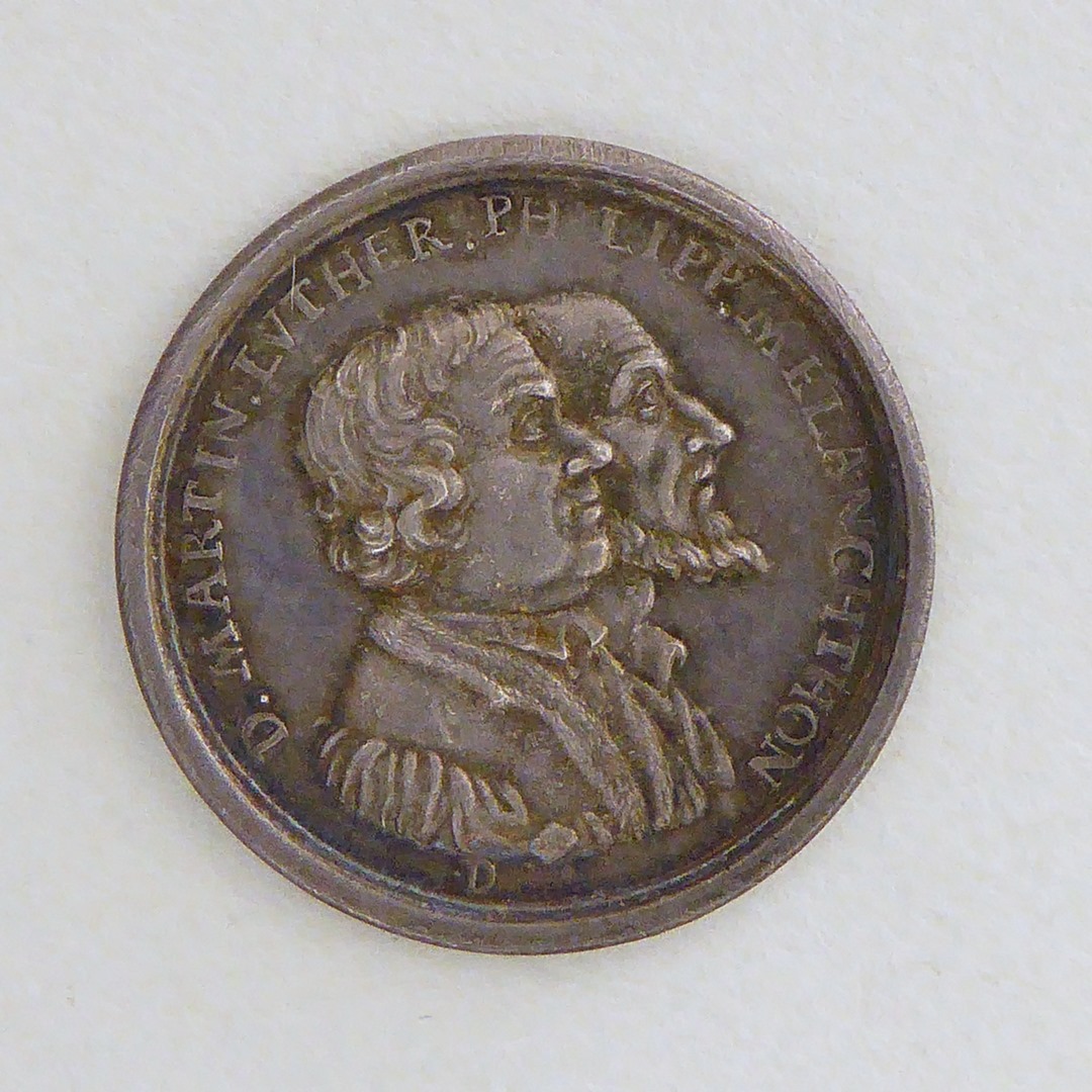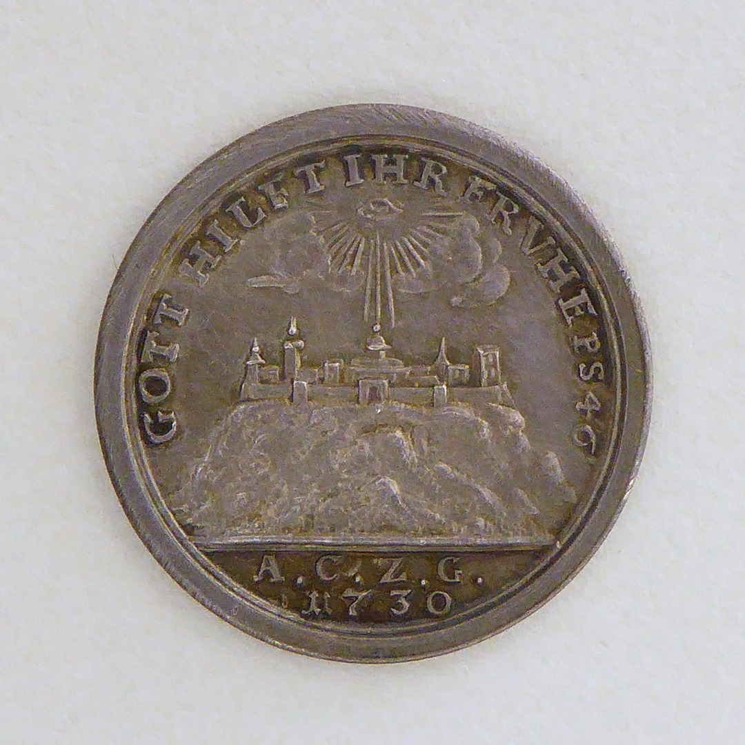 Penning, borstbeelden Luther, Melanchton, tekst, kz. stad op berg, met "Gott hilft... A.C.Z.G. 1730"