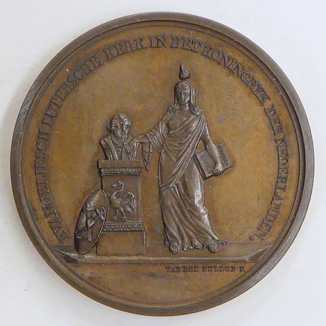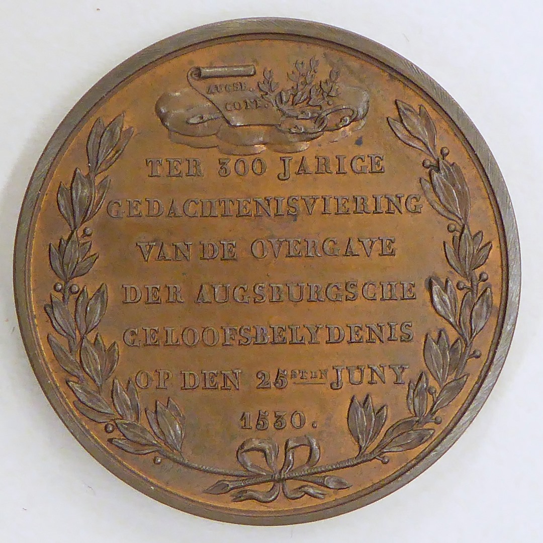 Penning, de Waarheid met bijbel, Luther, enz., kz. Augsburgse Confessie op boekrol, tekst