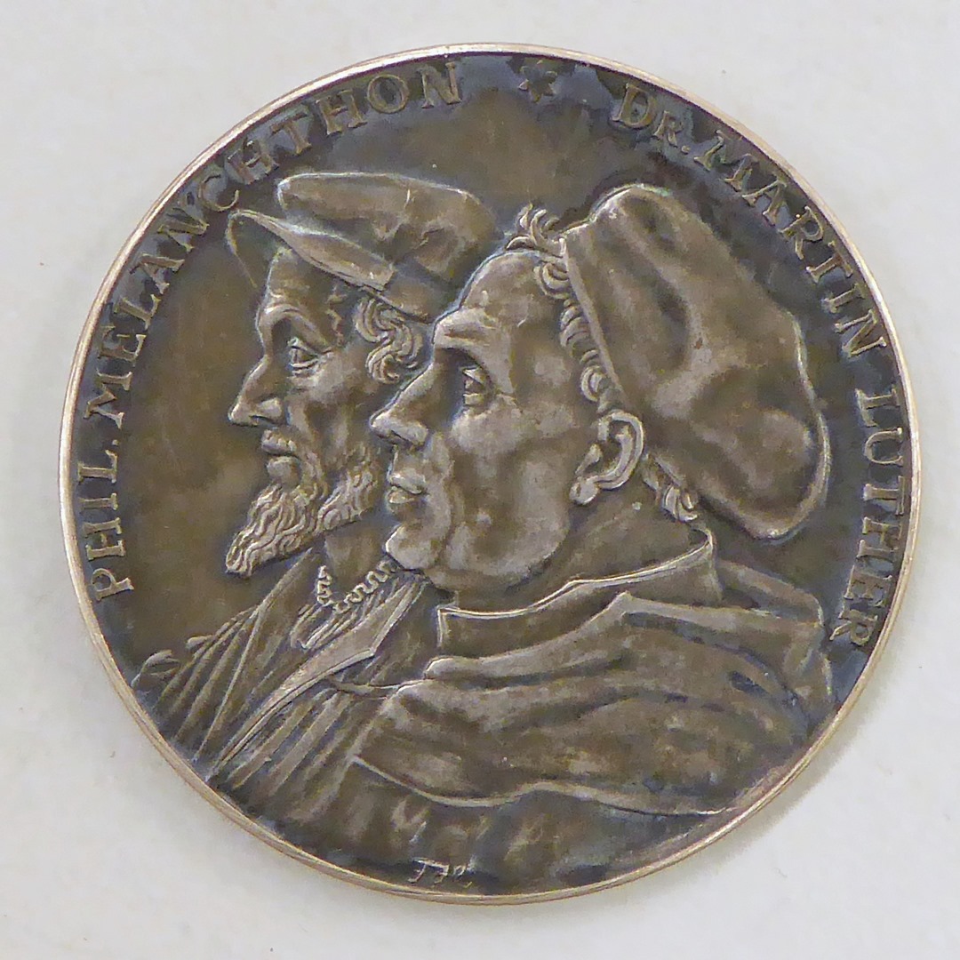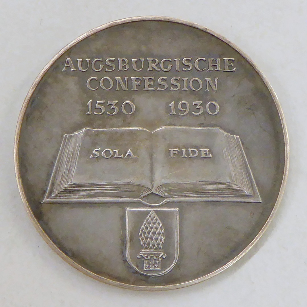 Penning, borstbeelden Luther, Melanchton, tekst, kz. open boek, wapen, tekst "Augsburgische ..."