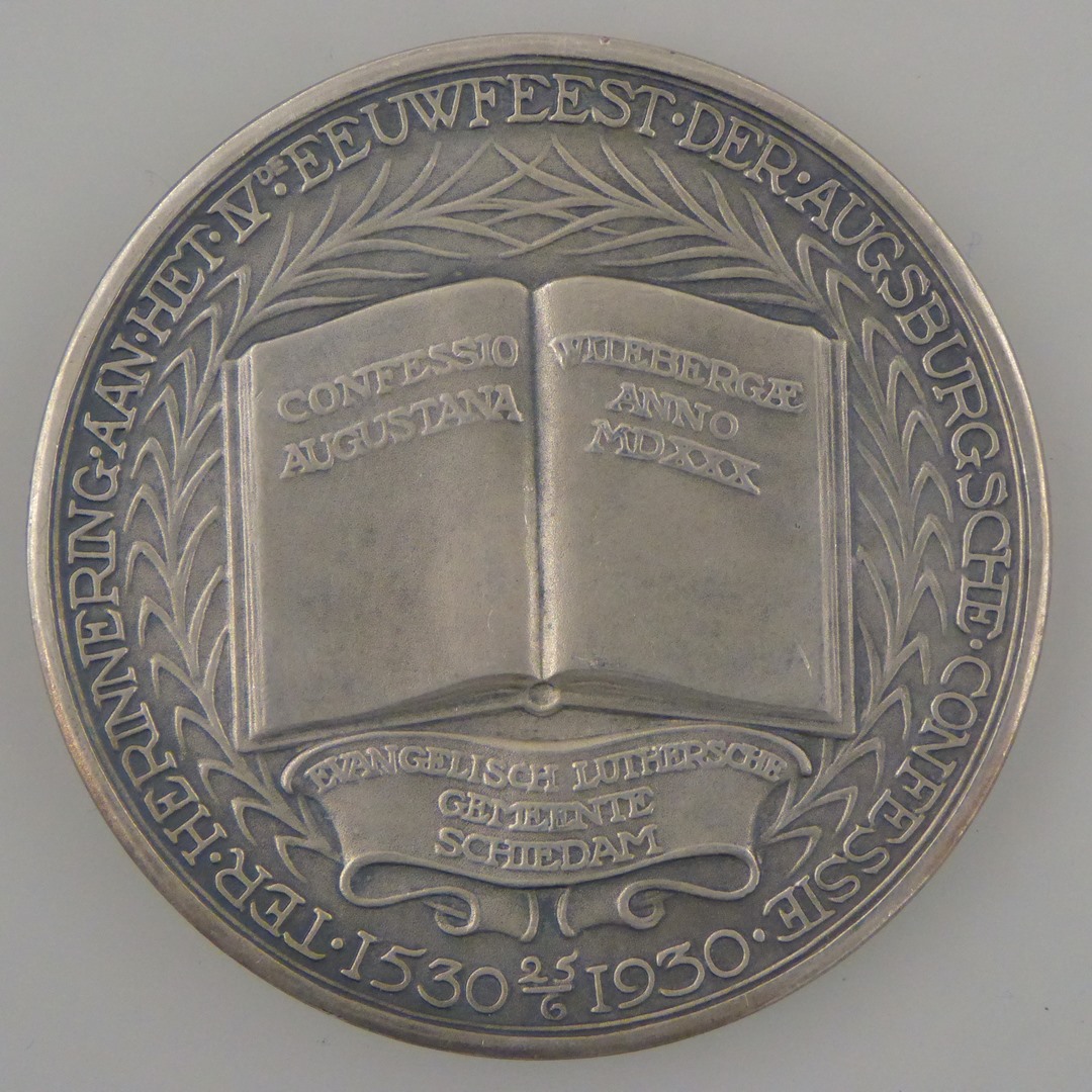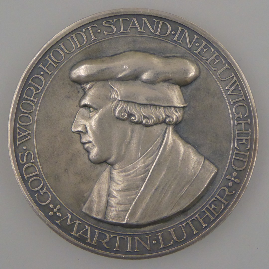 Penning met portret Luther, omschrift, kz. boek "Evangelisch Lutherse Gemeente Schiedam", tekstlint