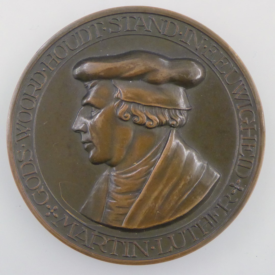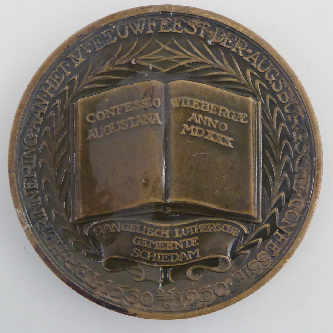 Penning met portret Luther, omschrift, kz. boek "Evangelisch Lutherse Gemeente Schiedam", tekstlint