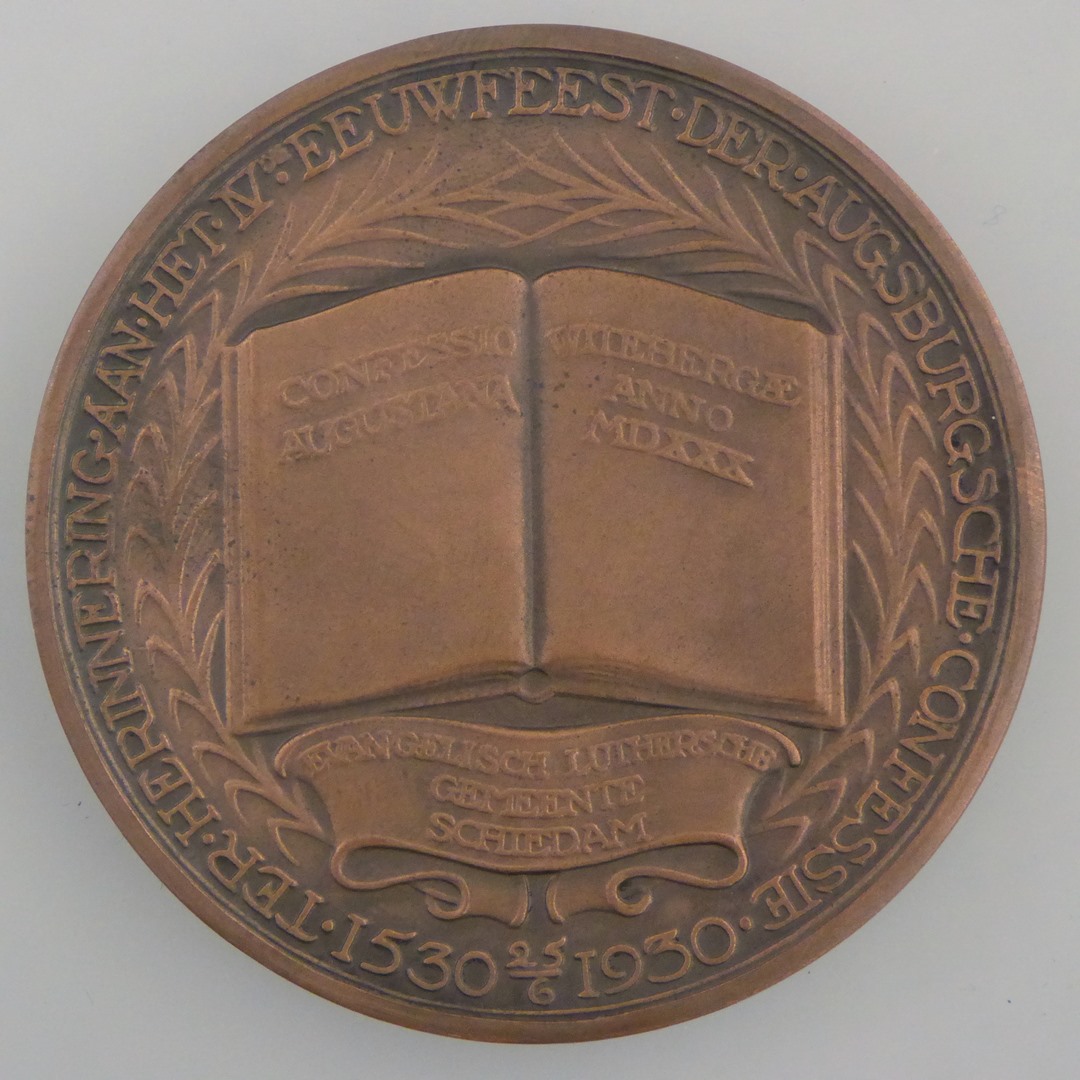 Penning met portret Luther, omschrift, kz. boek "Evangelisch Lutherse Gemeente Schiedam", tekstlint