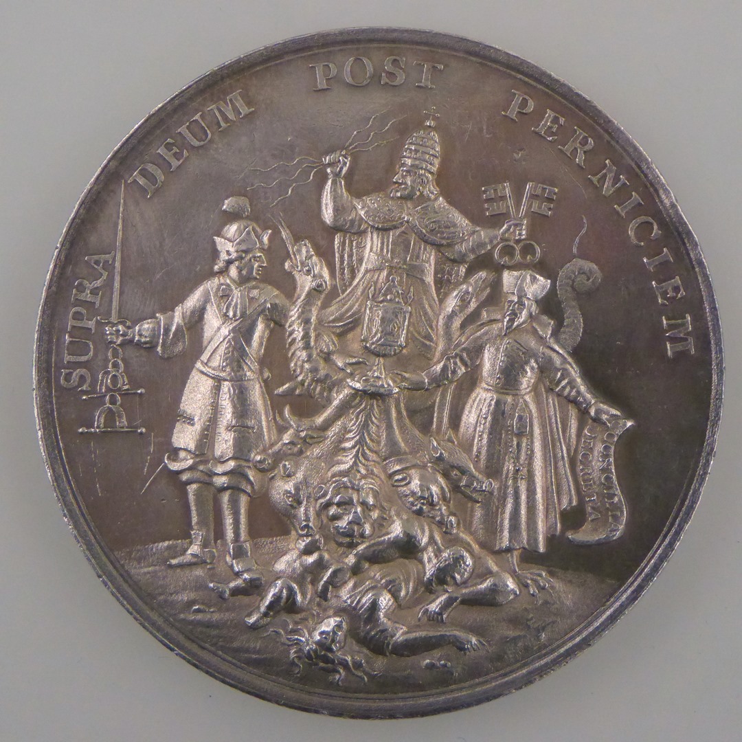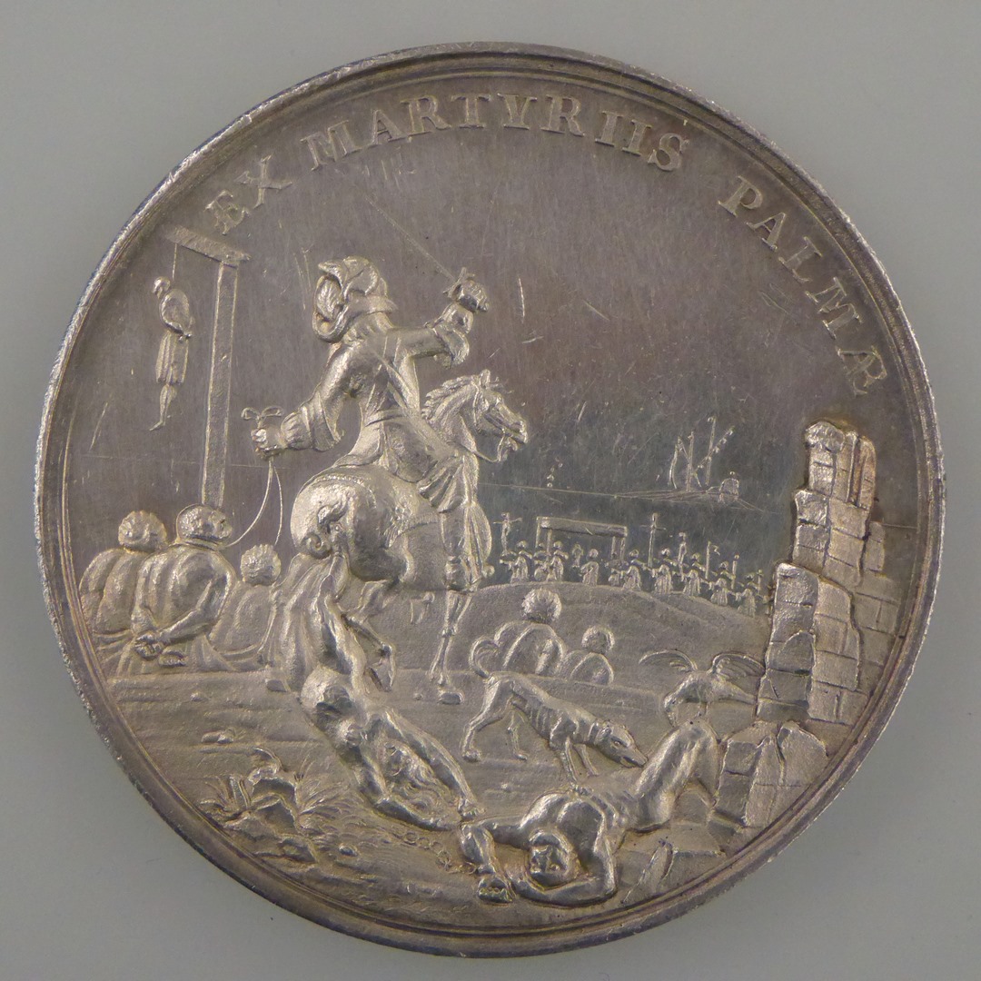 Historiepenning op vervolging der protestanten in Frankrijk met "Ex martyriis palmae", kz. o.a. paus