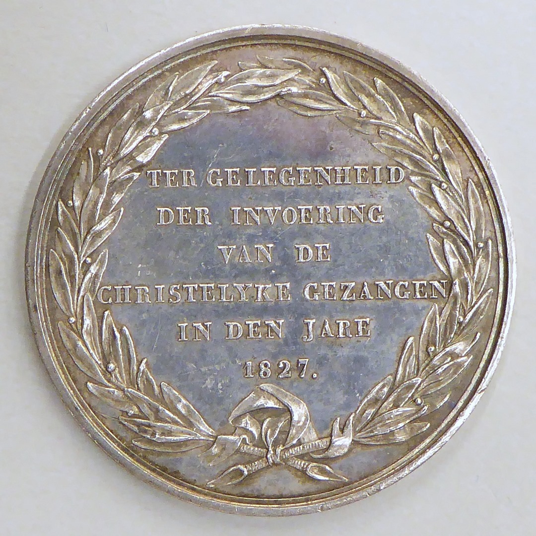 Penning, Luther met zwaan, ernaast Ecclesia, kz. "... invoering van de christelijke gezangen ..."