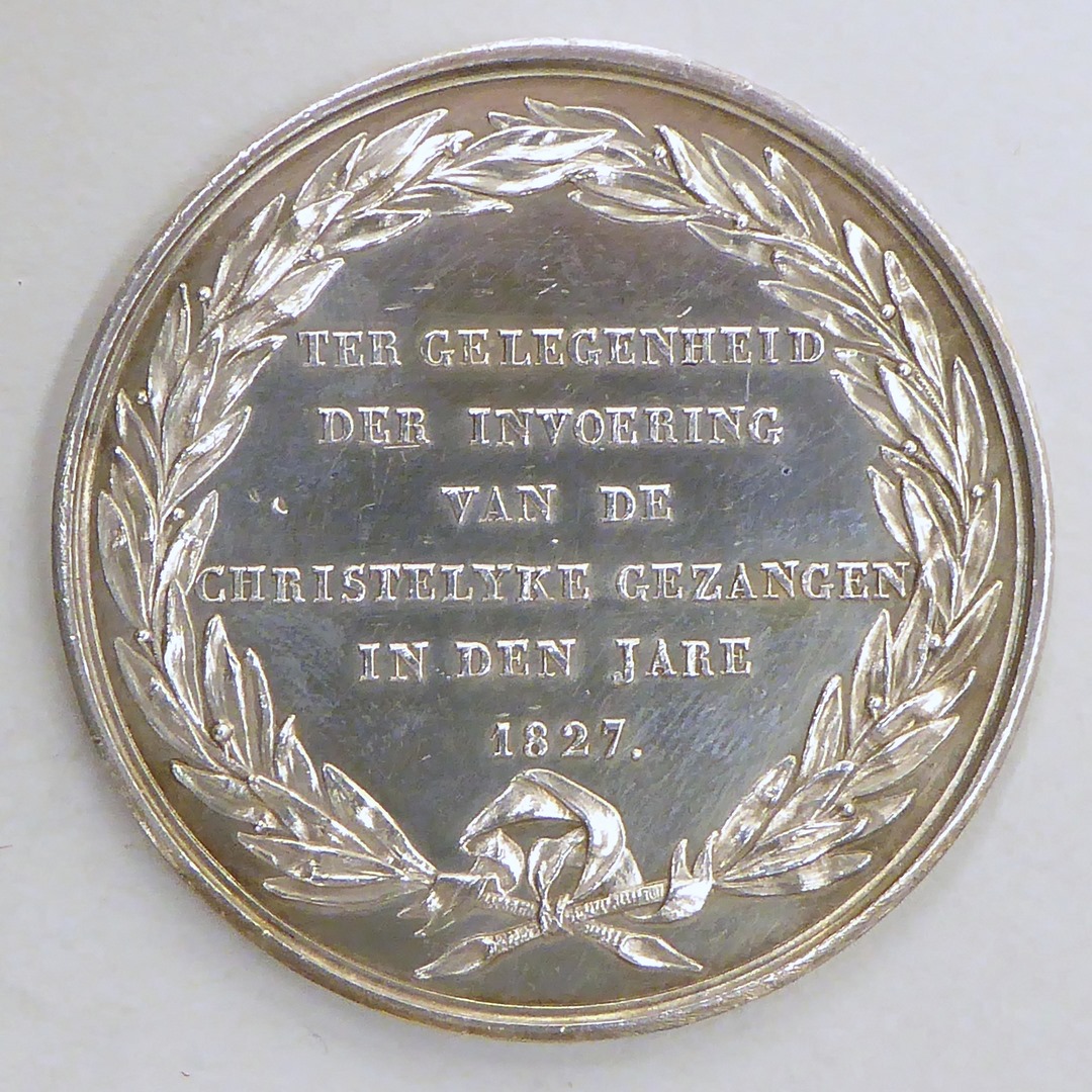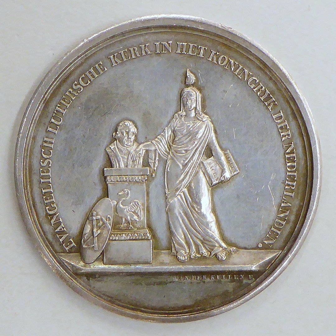 Penning, Luther met zwaan, ernaast Ecclesia, kz. "... invoering van de christelijke gezangen ..."