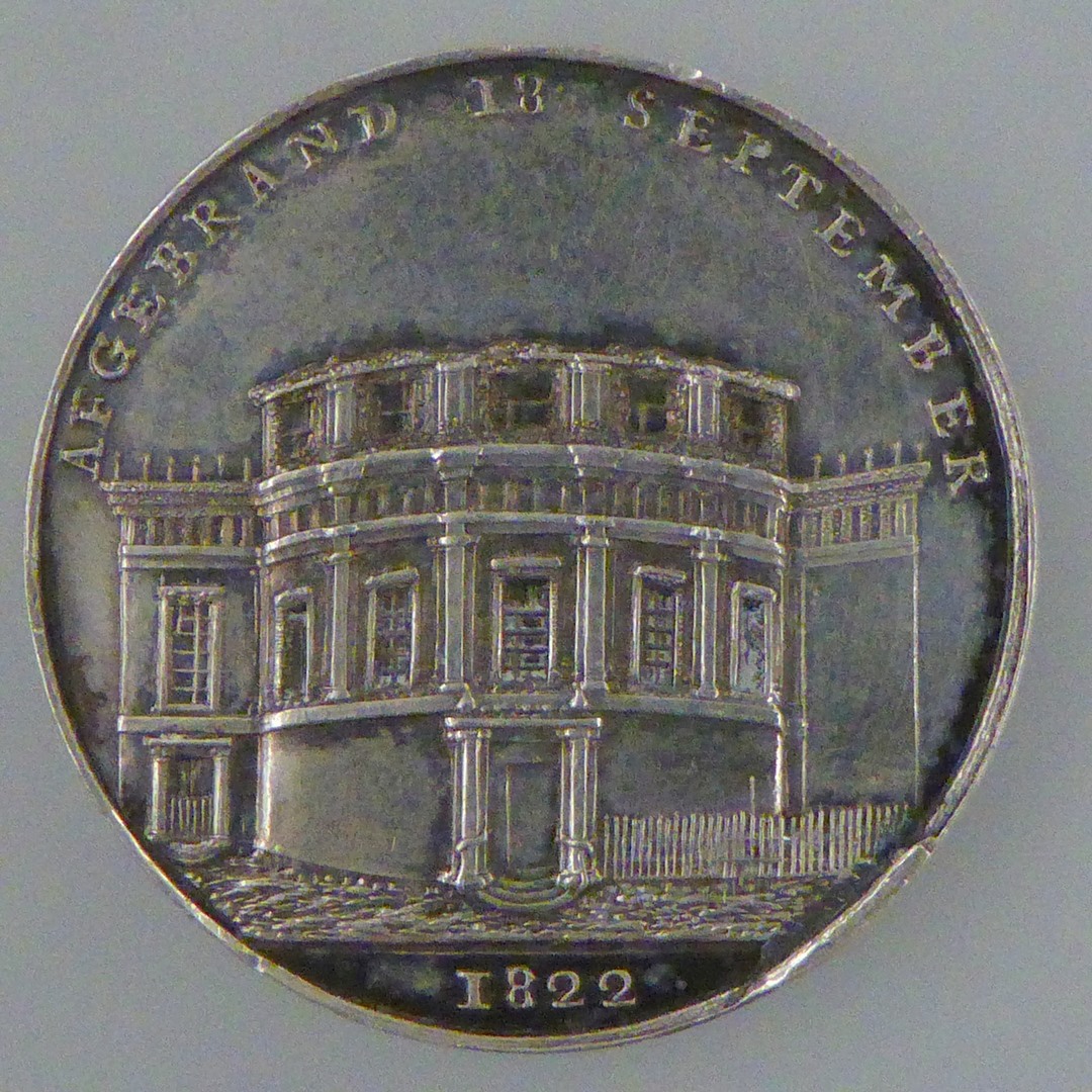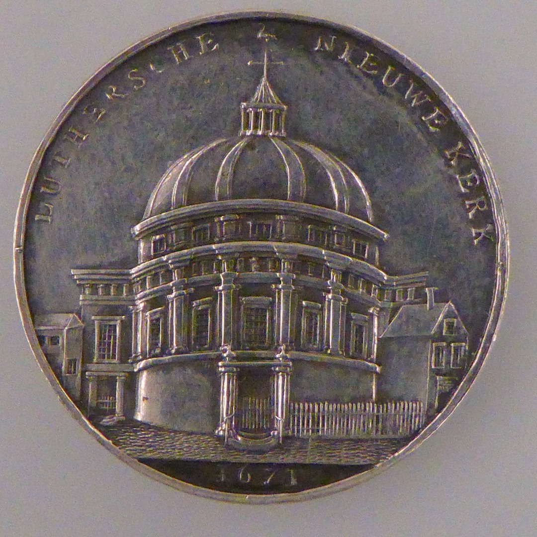 Penning, Lutherse Nieuwe Kerk en "1761", kz. dezelfde kerk en "Afgebrand 18 september 1822"