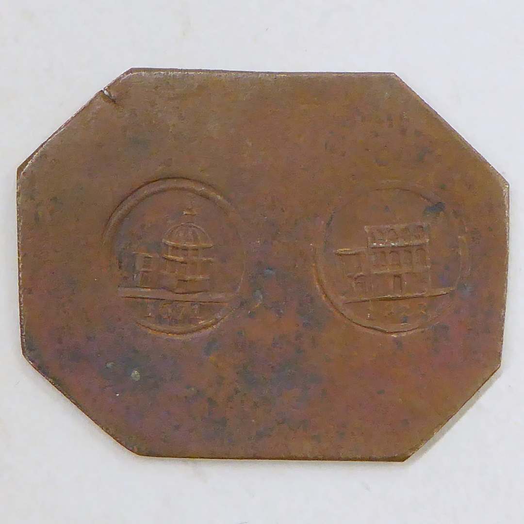 Plaatje koper uit dak van Ronde Lutherse Kerk te Amsterdam na de brand, met stempels "1671 1822"