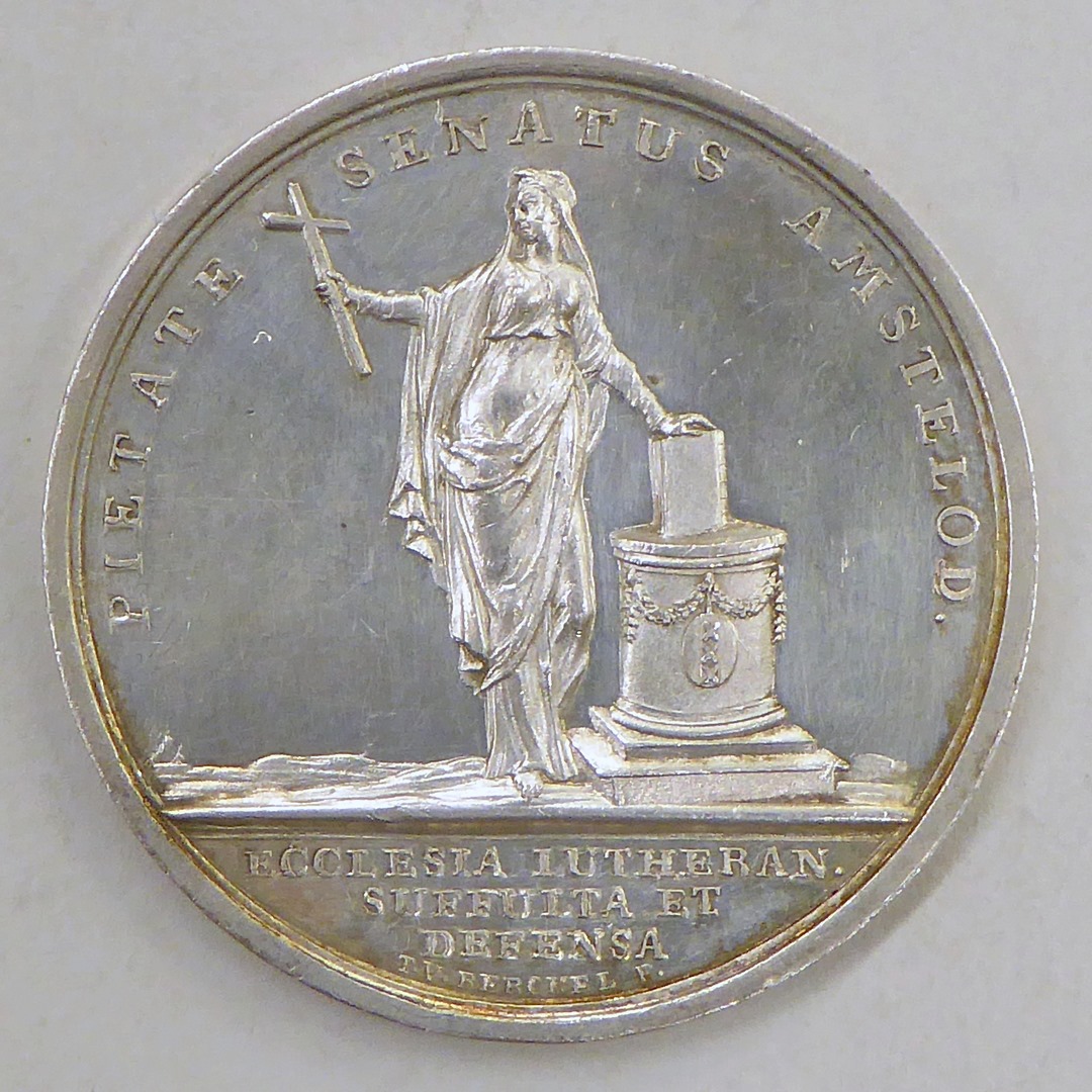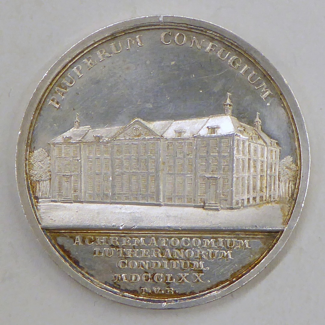 Penning, afbeelding van Luthers Weeshuis Amsterdam, tekst, kz. geloof, tekst