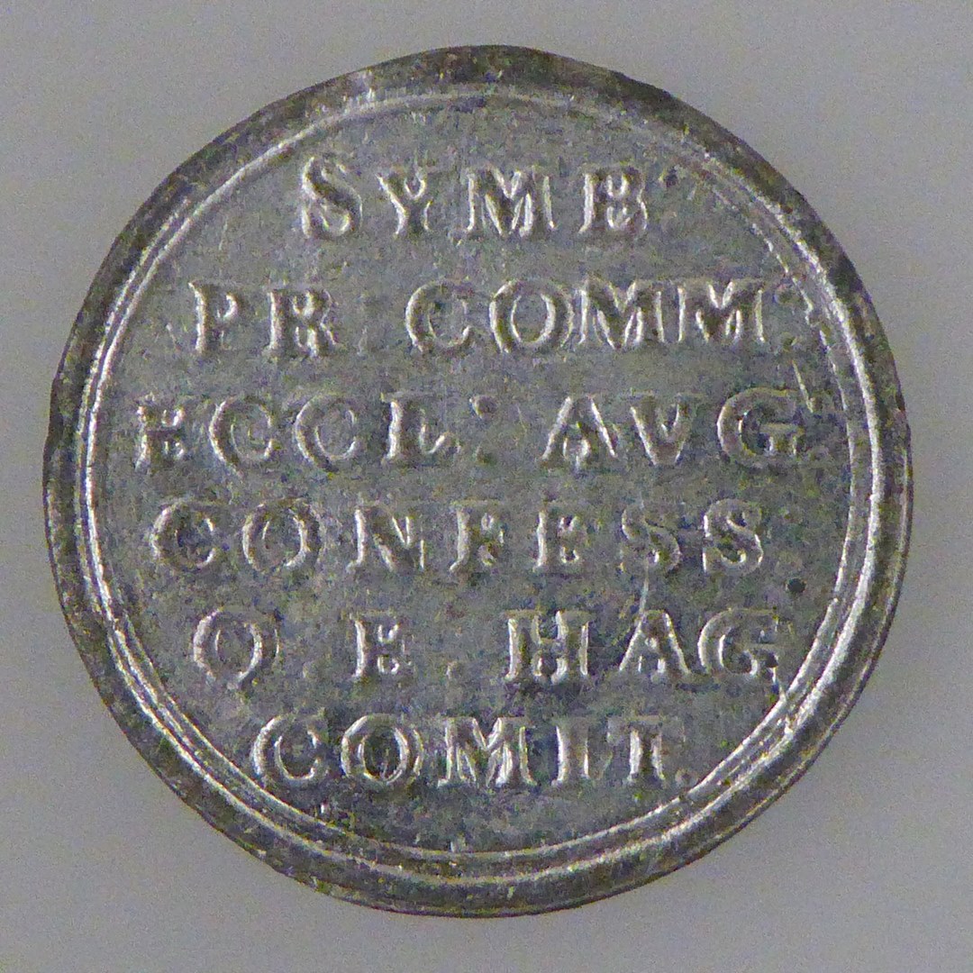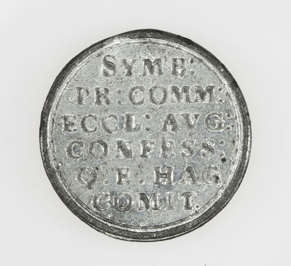 Avondmaalsloodje met "Symb. Pr...Q.E. Hag. Comit.", uit Lutherse kerk te Den Haag, kz. blanco