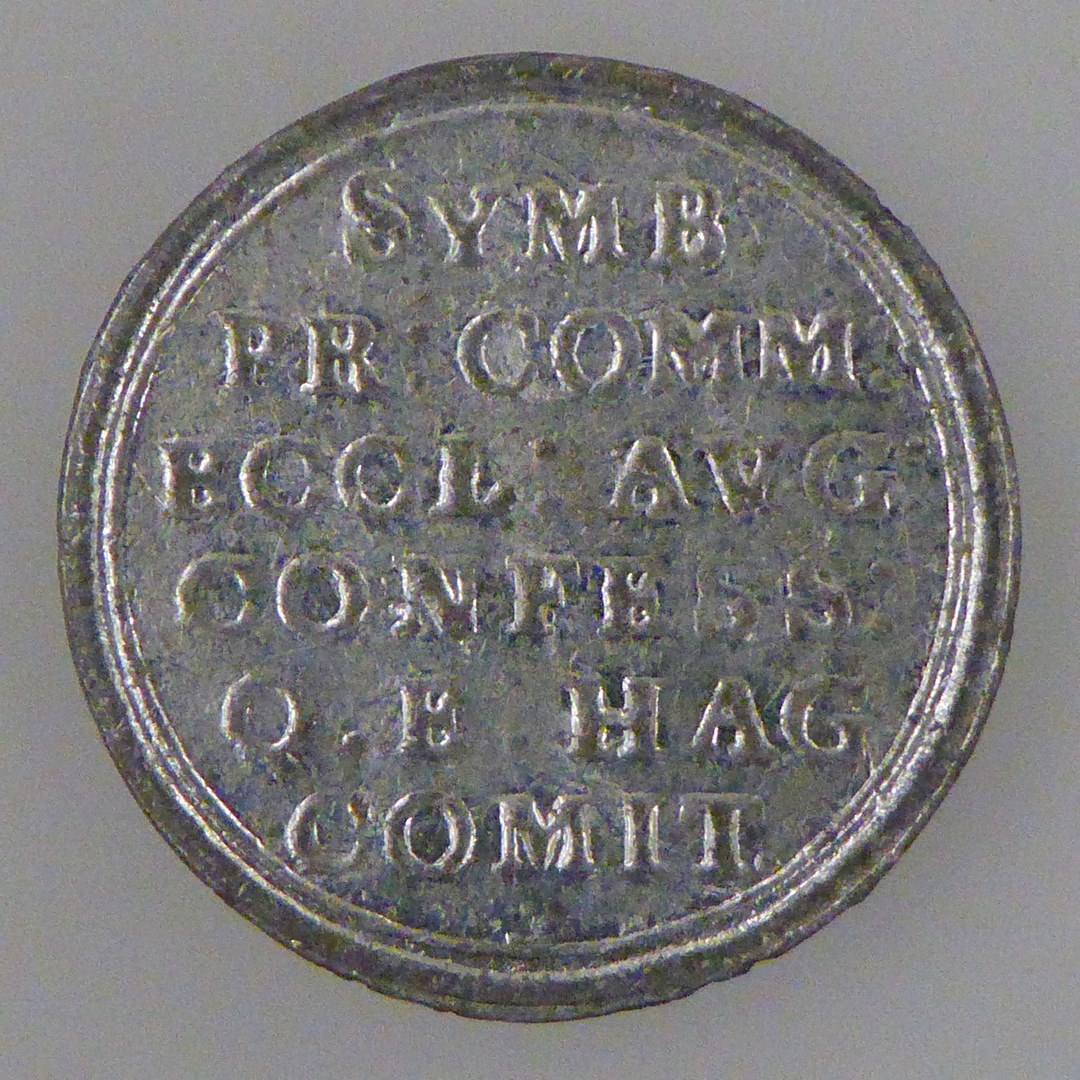 Avondmaalsloodje met "Symb. Pr...Q.E. Hag. Comit.", uit Lutherse kerk te Den Haag, kz. blanco