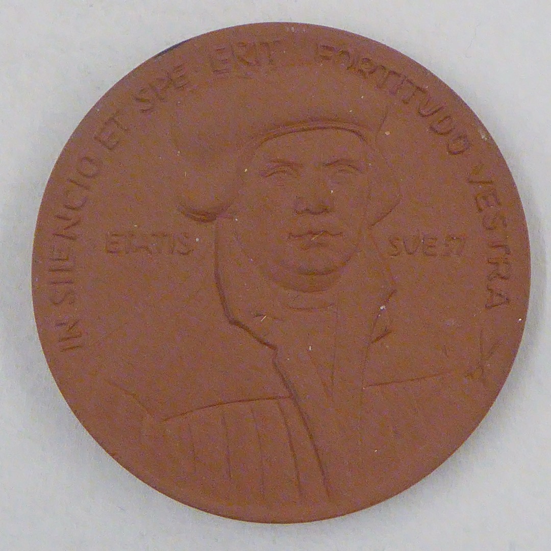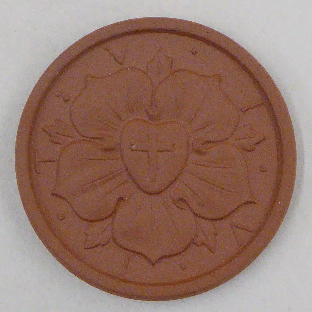 Penning met Luther ten halve lijve, met "In silencio ... sue 57", kz. Lutherroos en "VIVIT"