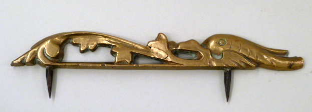 Langwerpig element met krulmotief en dolfijn, met afgebroken staart, hoort bij SPKK m179a