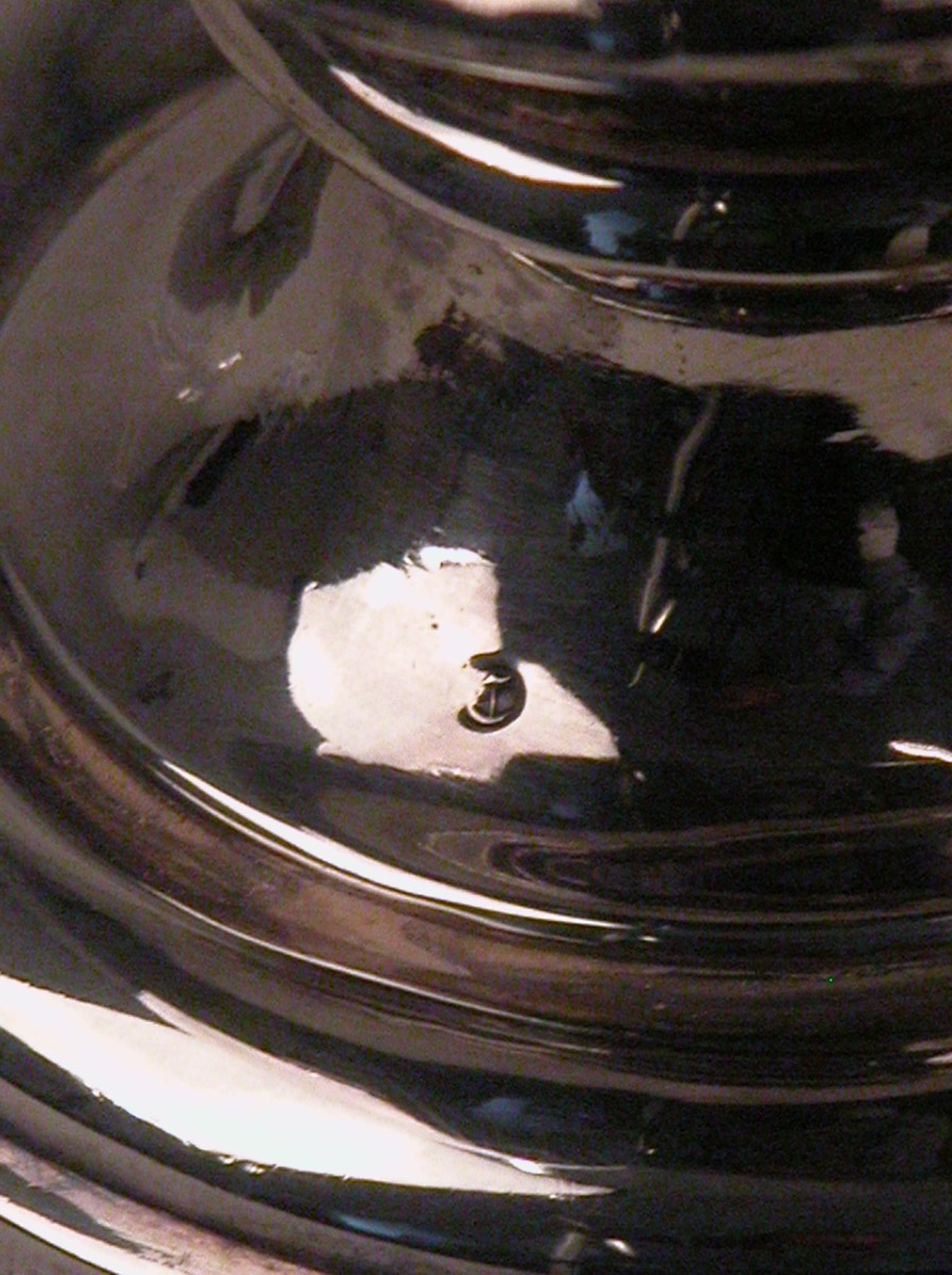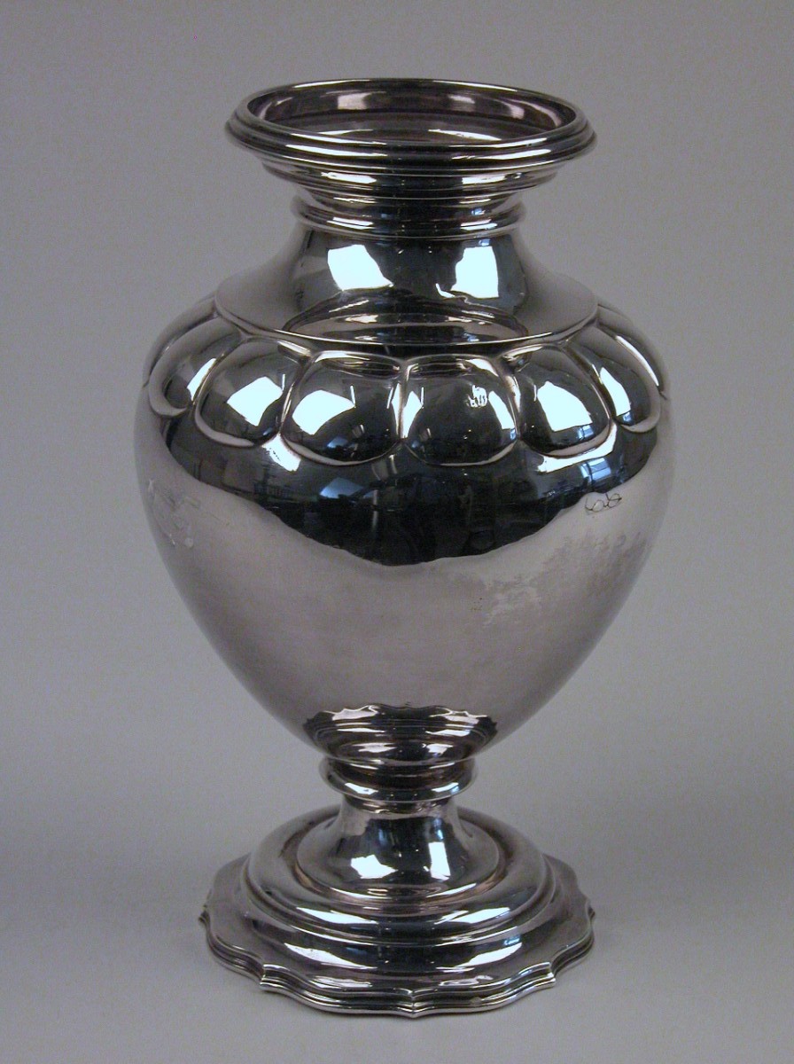 Buikvormige gelobde offervaas van avondmaalsstel, onderzijde met "Remonstrantsche Gemeente Rotterdam 1887"