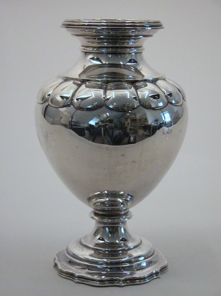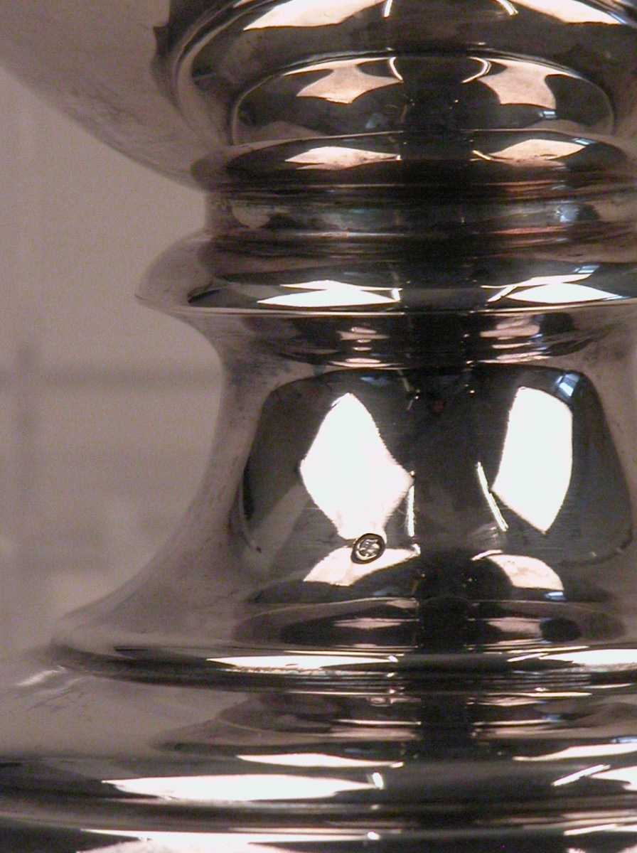 Buikvormige gelobde offervaas van avondmaalsstel, onderzijde met "Remonstrantsche Gemeente Rotterdam 1887"