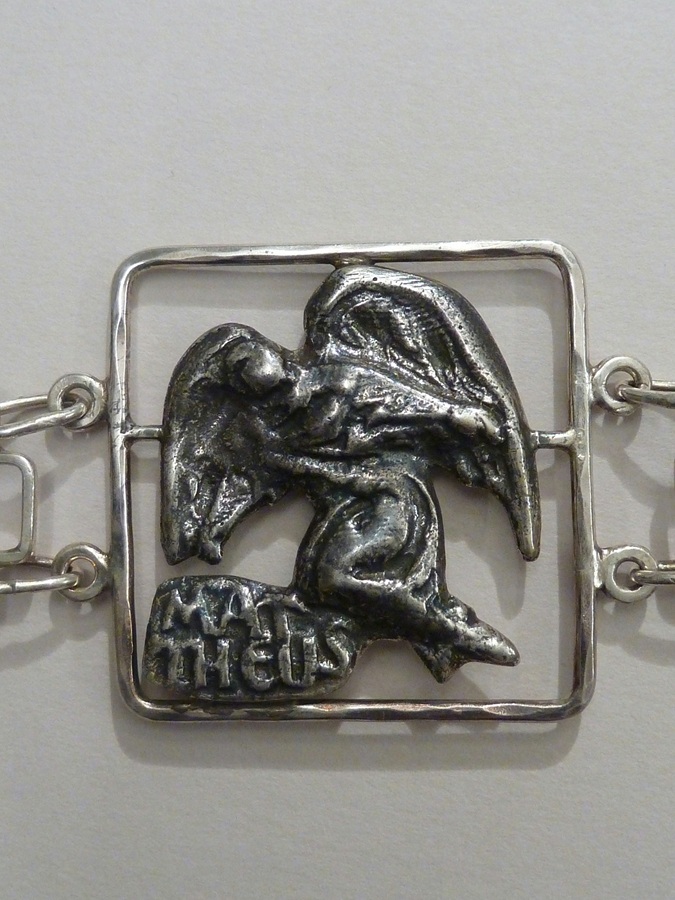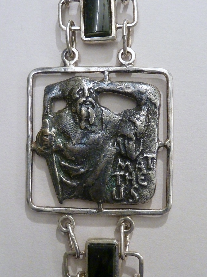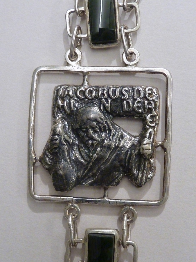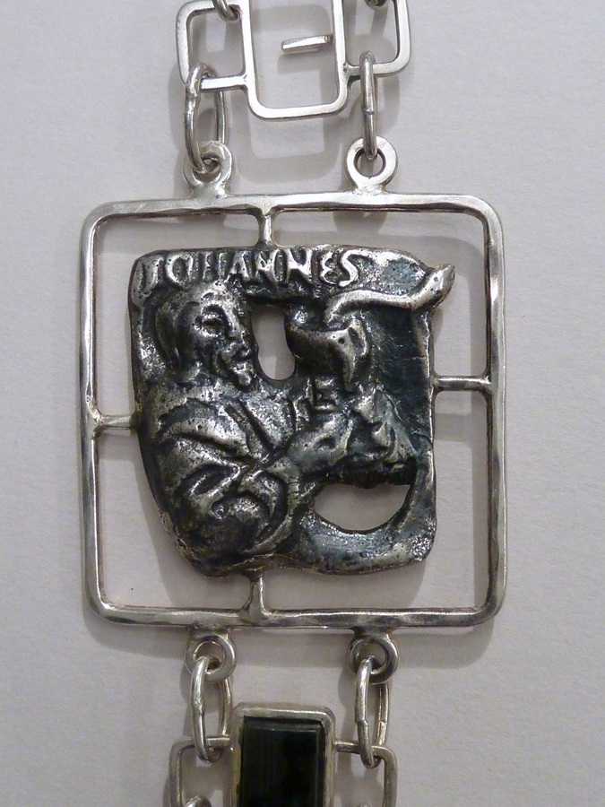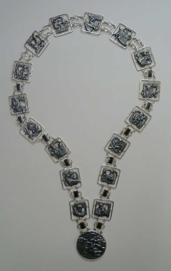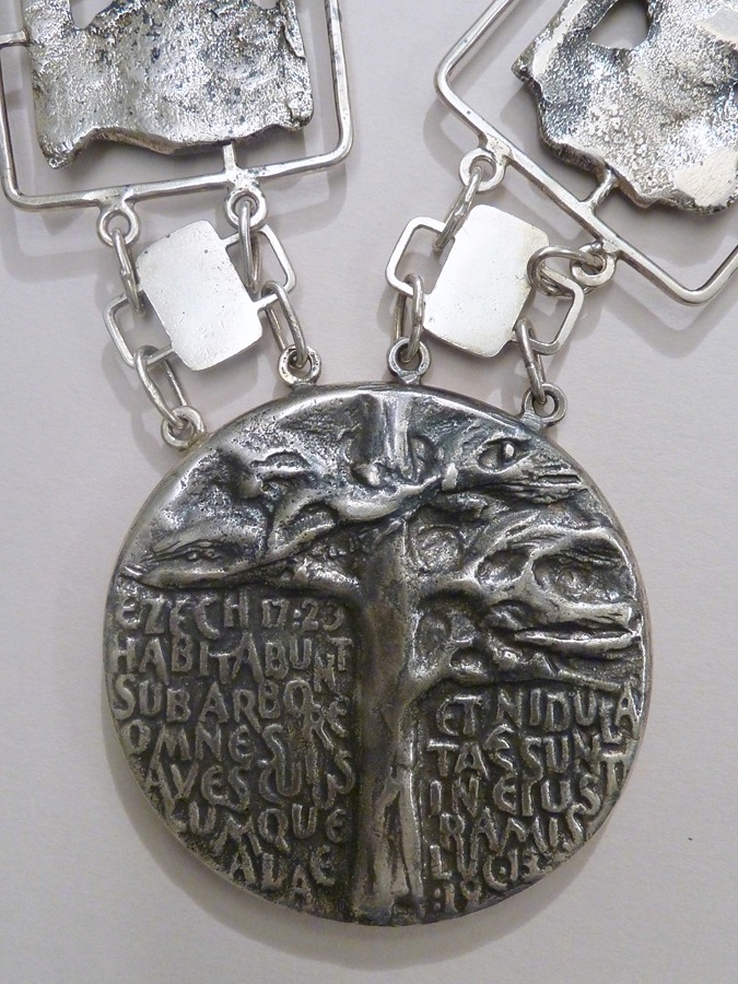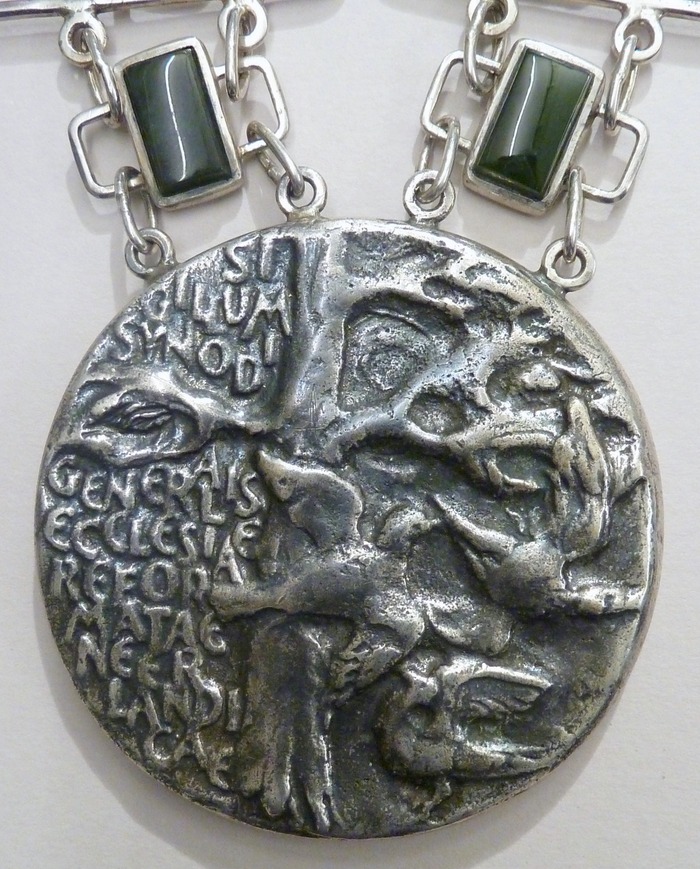 Ambtsketen van de preses van de Nederlands hervormde synode met hanger waarop Latijnse tekst en cederboom met vogels, met schakels waarin evangelistensymbolen en twaalf apostelen