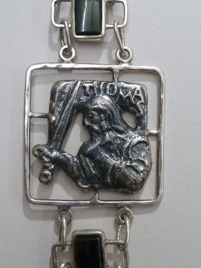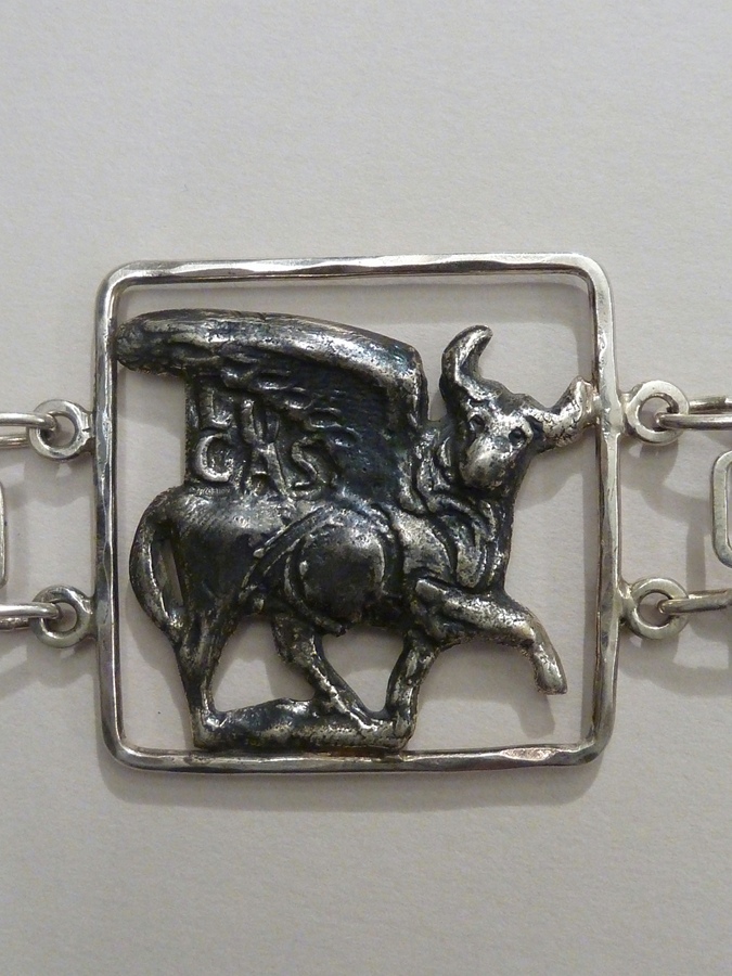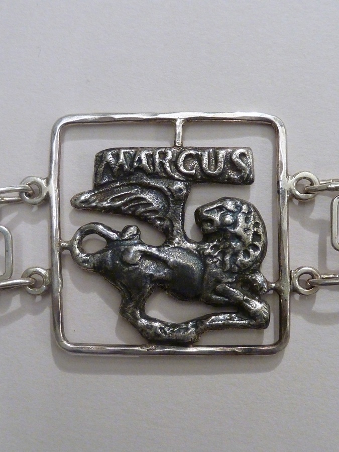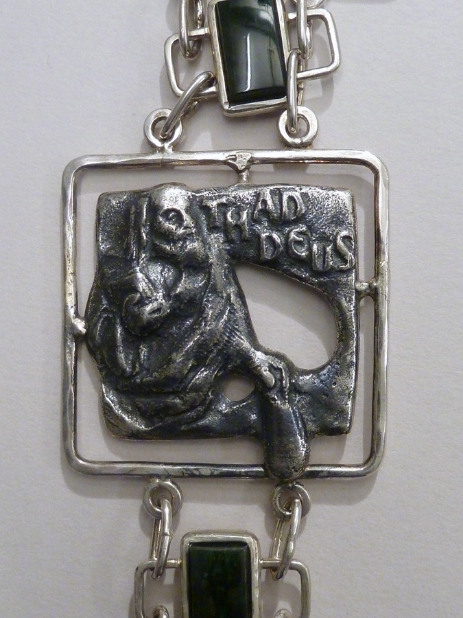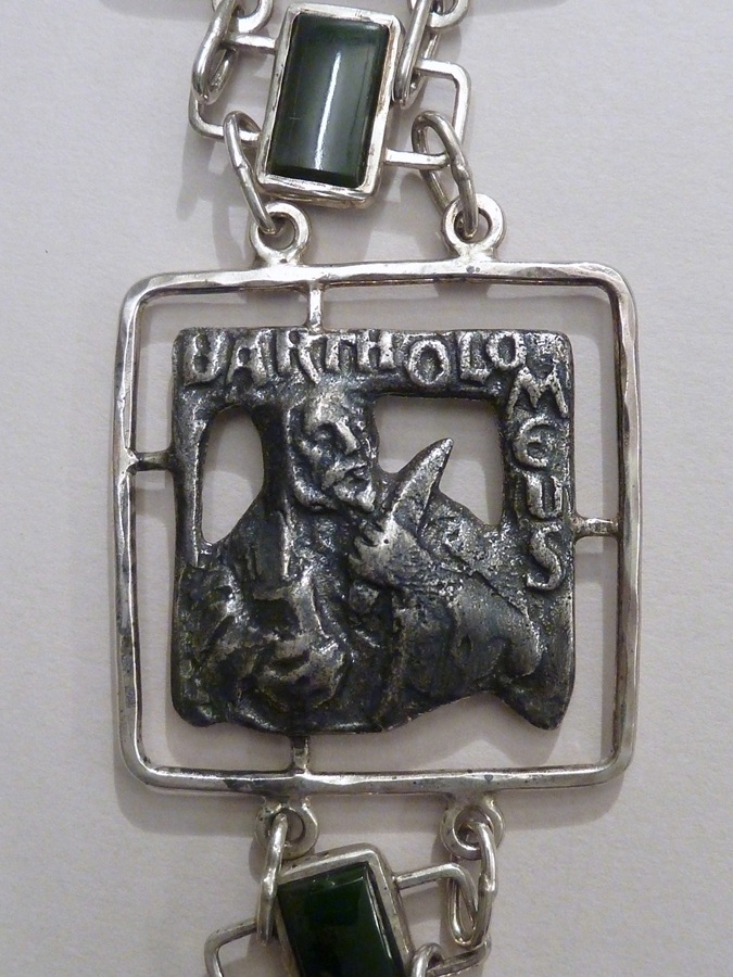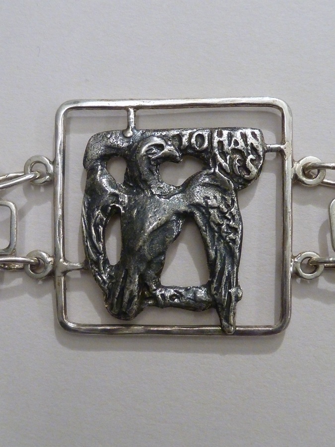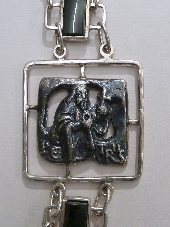 Ambtsketen van de preses van de Nederlands hervormde synode met hanger waarop Latijnse tekst en cederboom met vogels, met schakels waarin evangelistensymbolen en twaalf apostelen