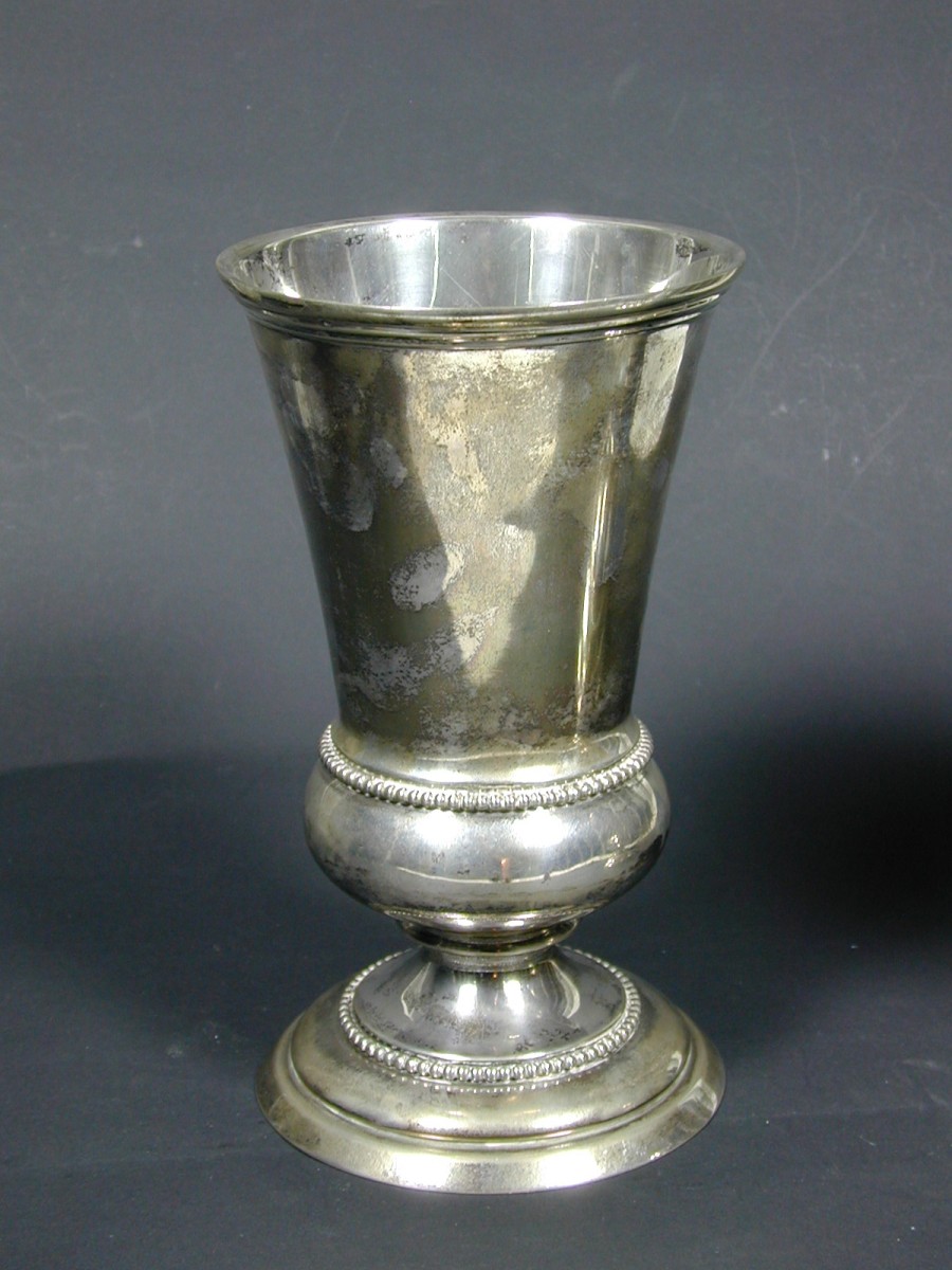 Avondmaalsbeker op voet, wijd uitlopend, met twee parelranden