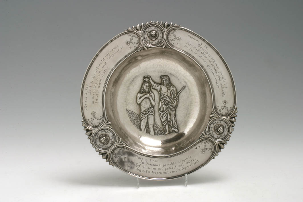 De voorstelling van de Doop van Jezus in de Jordaan op deze doopschaal is omringd met bijbelsteksten die de visie op de kinderdoop onderbouwen. Ze luidden: Rechts: Marcus X: XIV Laat de kinderkens tot mij komen en verhindert ze niet, want derzulken is het Koninkrijk Gods. Links: Marcus X: XV Voorwaar zeg ik u: zoo ...