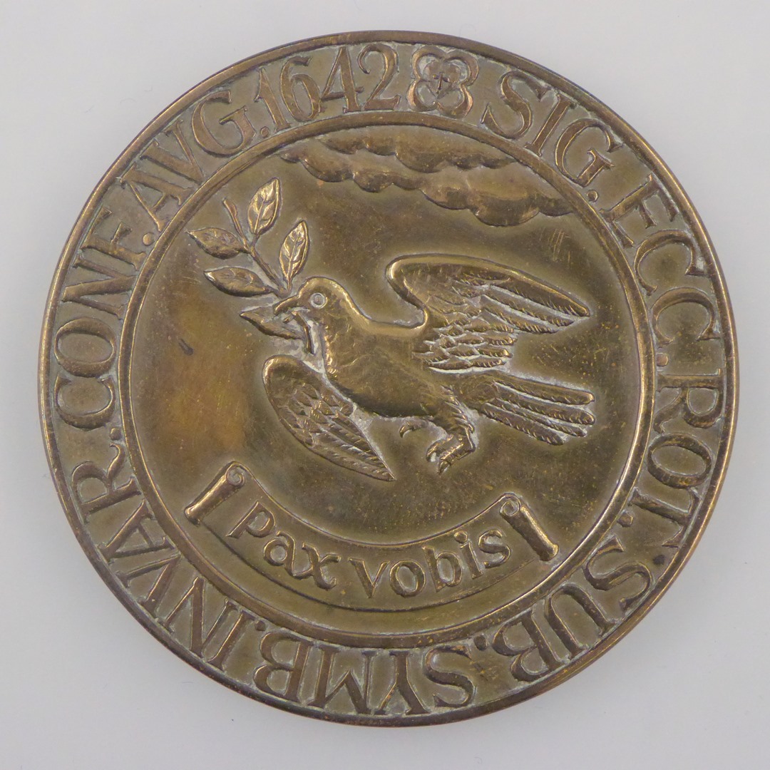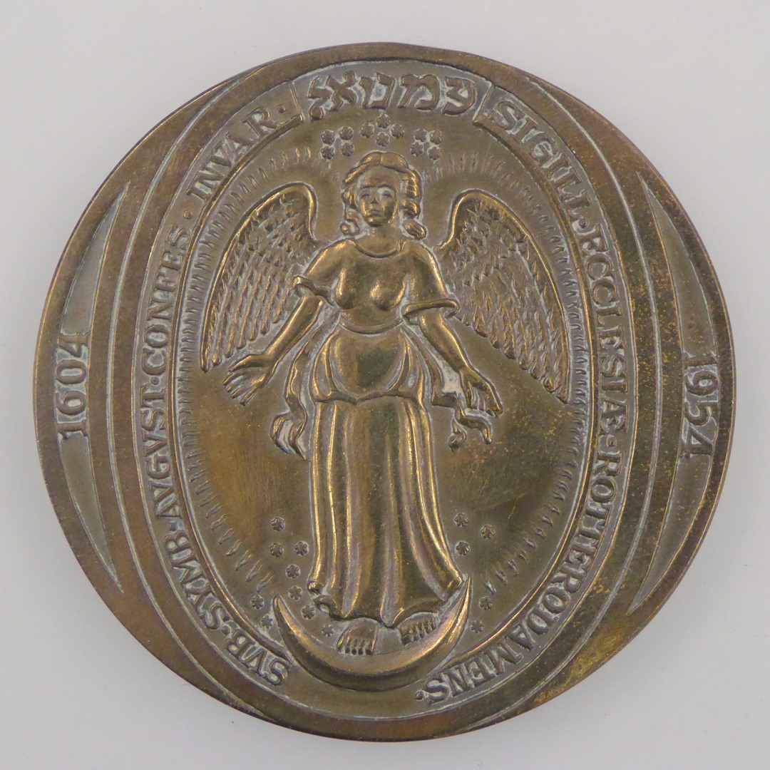 Penning op het 350-jarig bestaan van de Evangelisch Lutherse Gemeente Rotterdam, met engel met randschrift "Sub symb. August...", kz. duif met olijftak, met "1604 1954"
