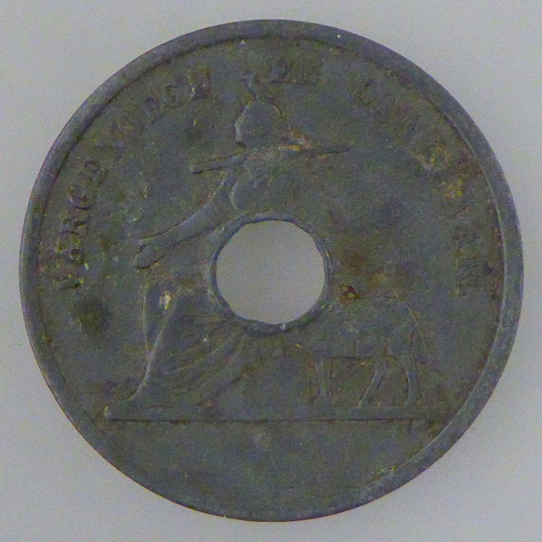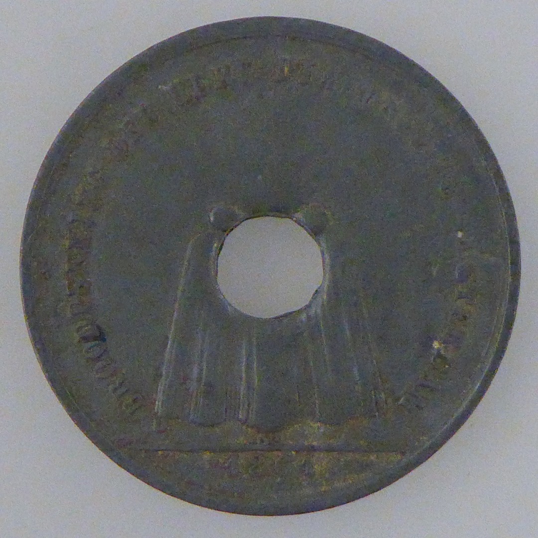 Broodpenning met gat, van hervormde diaconie te Amsterdam met zittende Barmhartigheid met lam en met "vergenoegd ...", kz. tafel met vier broden, met "broodpenning der herv. diakonie te Amsterdam"