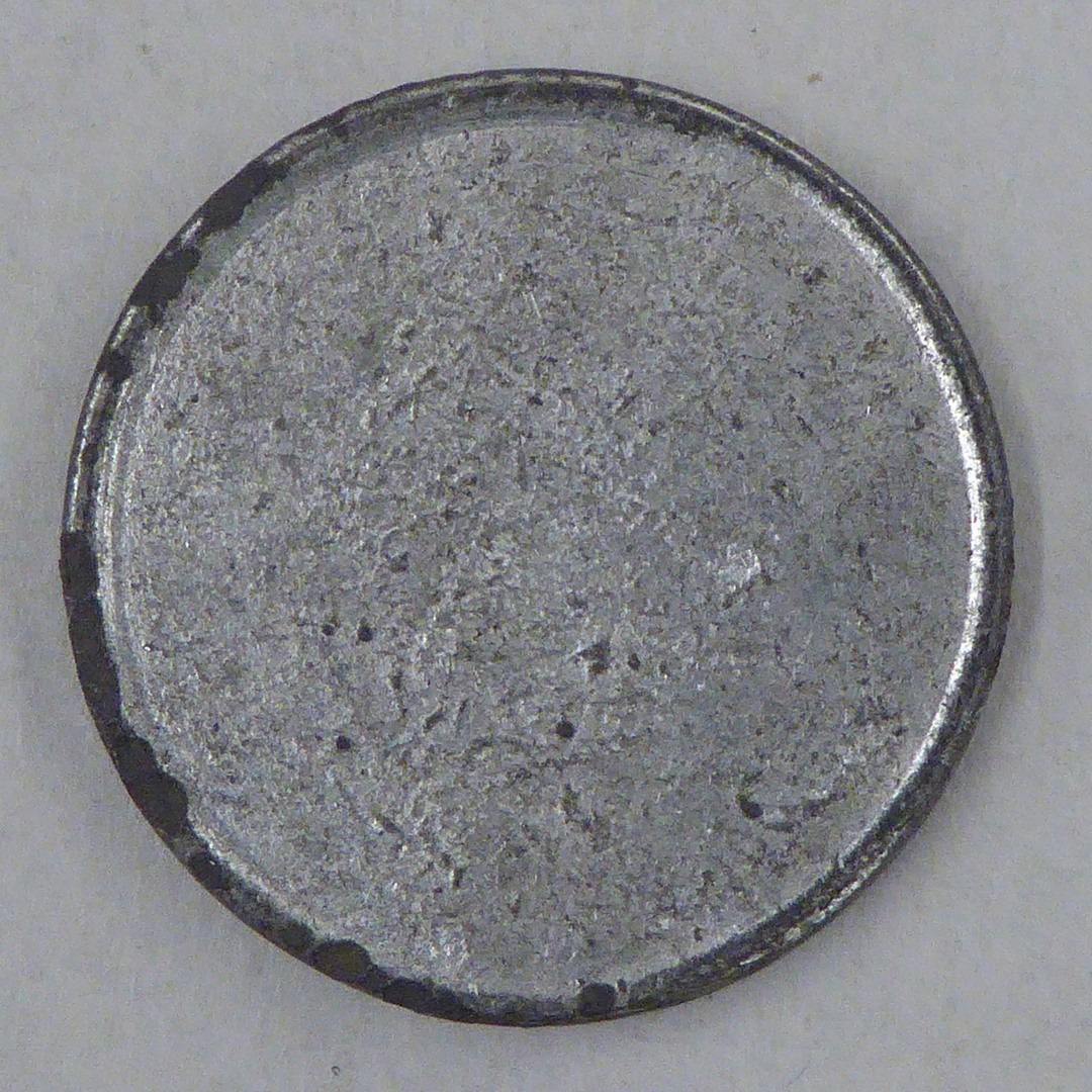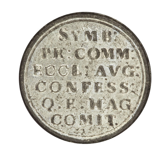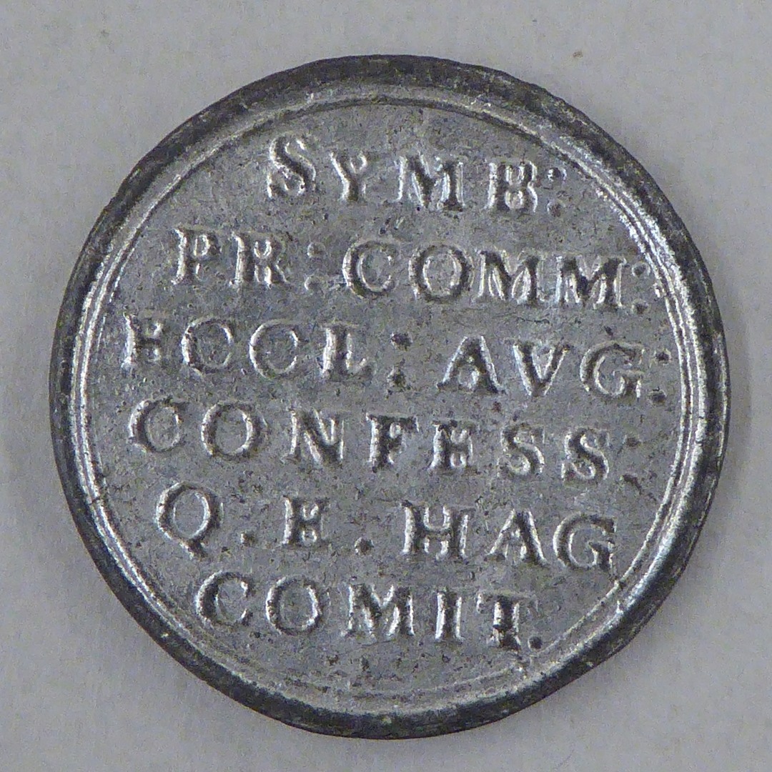 Avondmaalsloodje van de Lutherse Kerk te Den Haag met "Symb:pr:comm:...Hag comit", kz. blanco